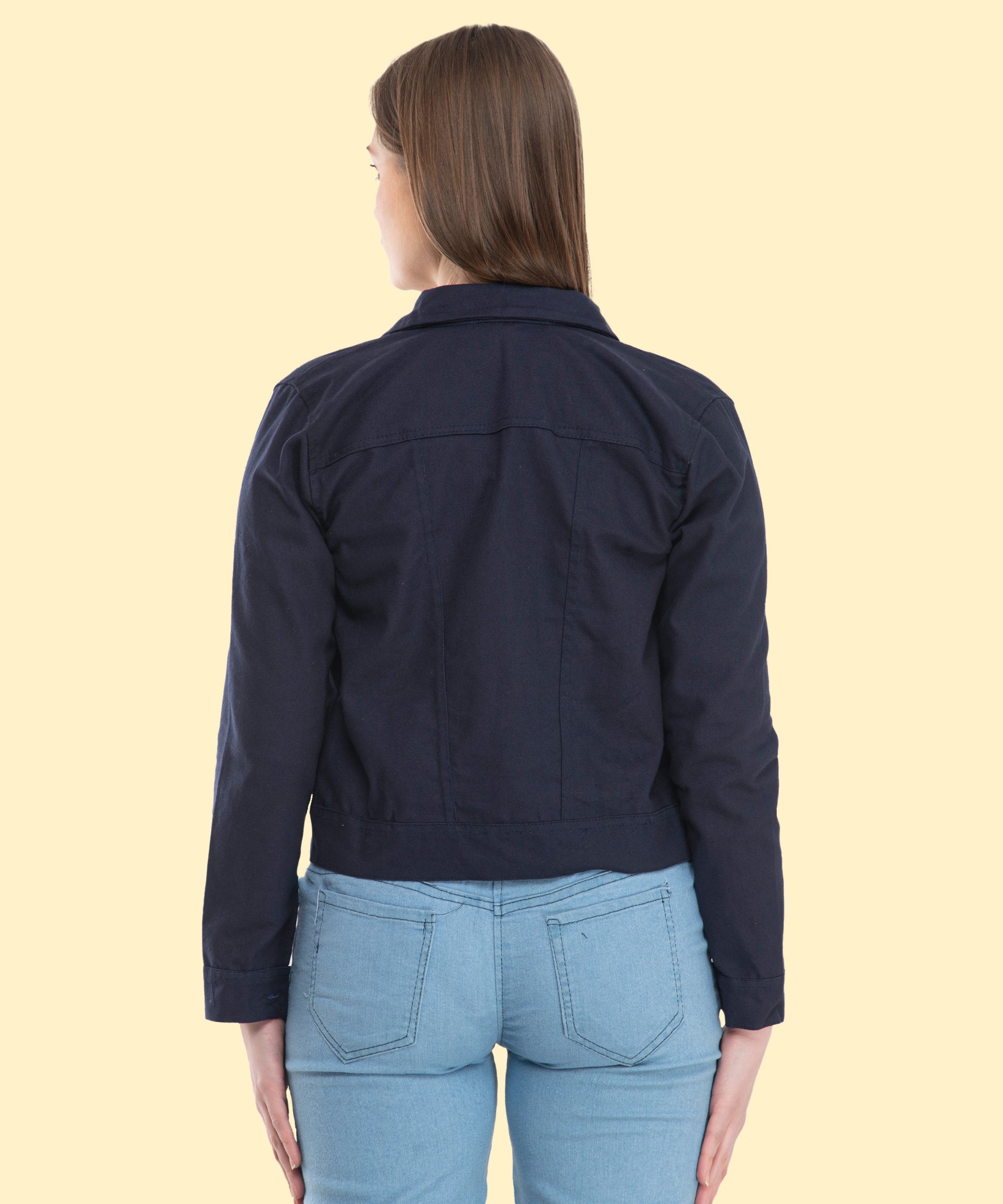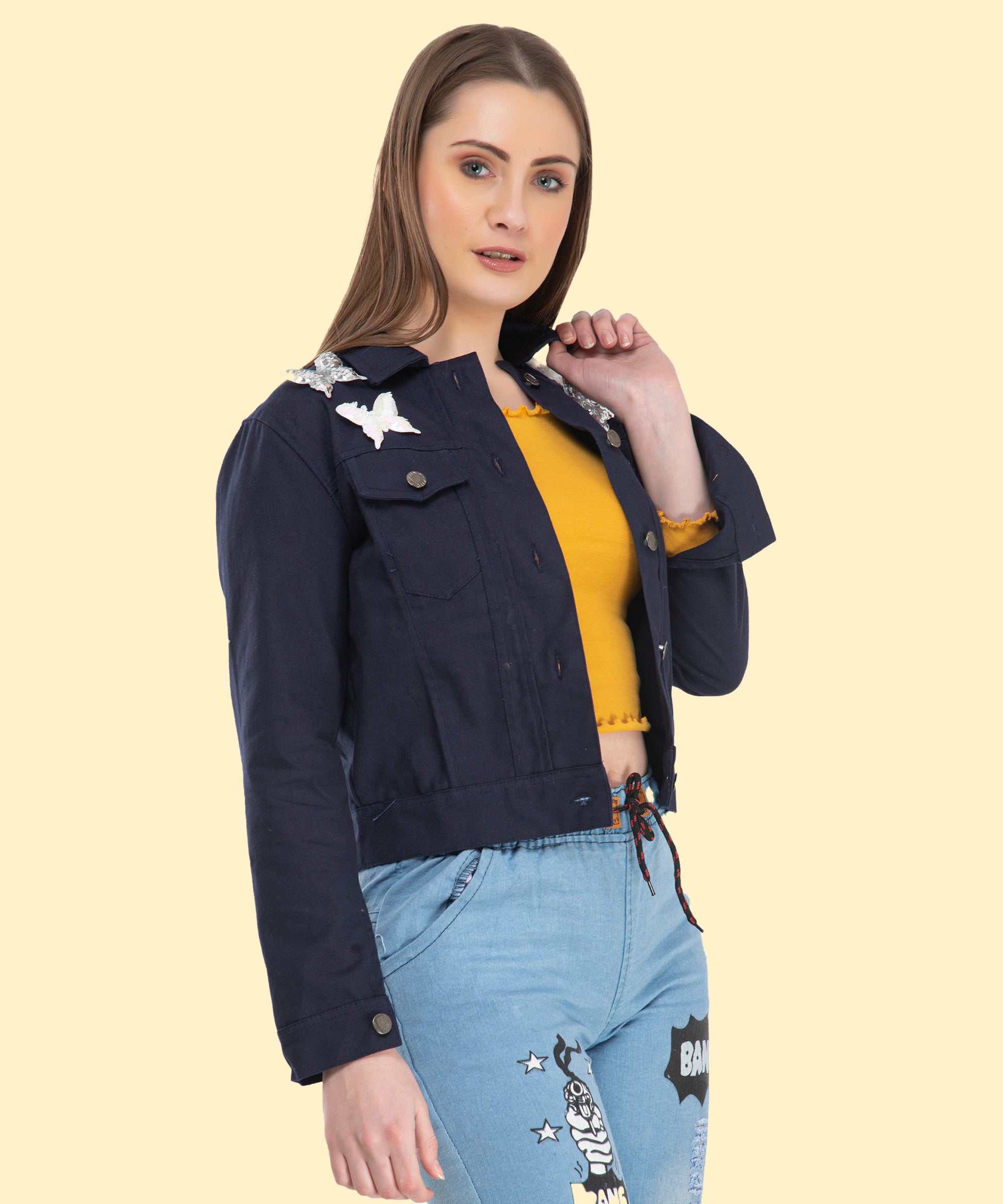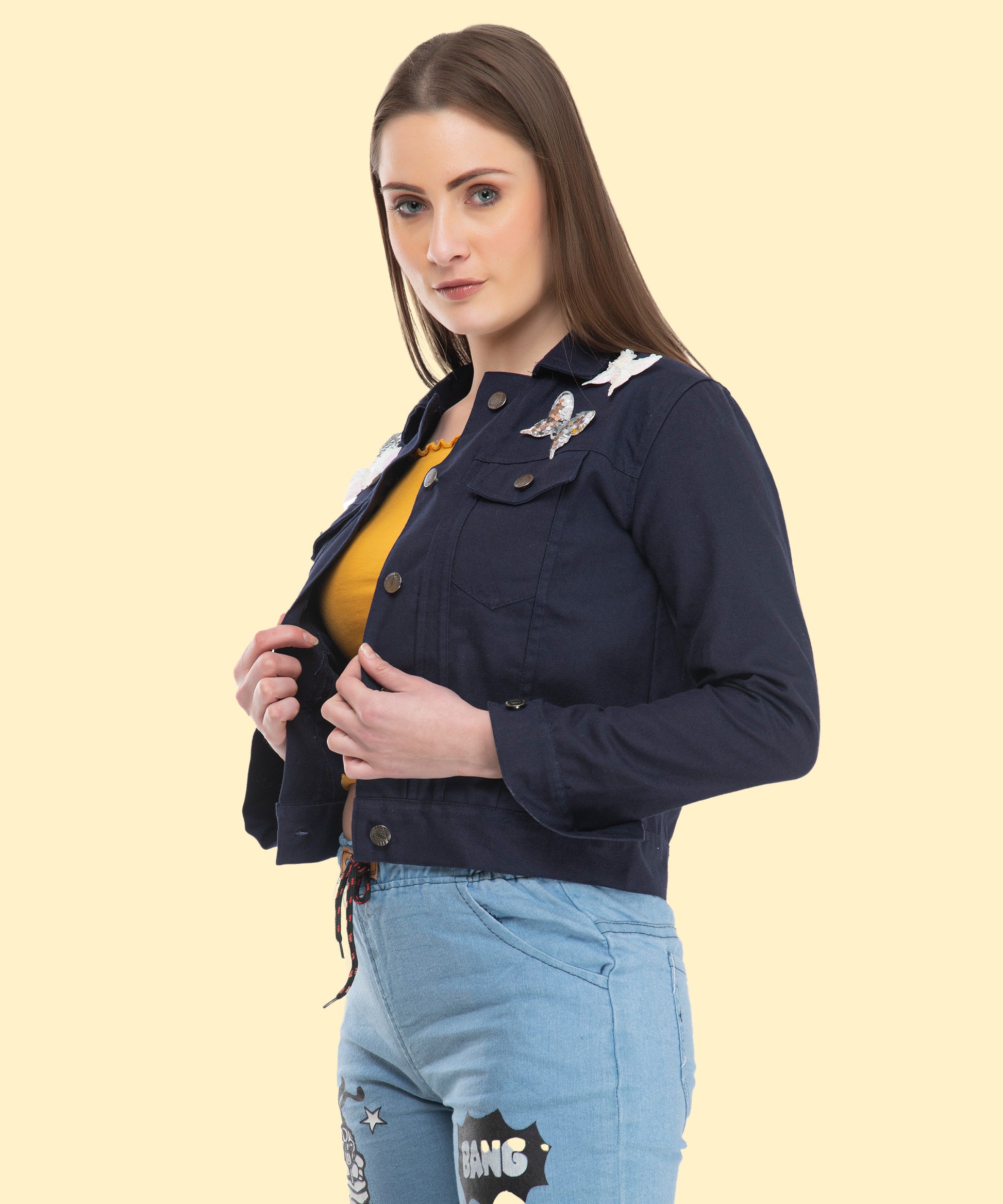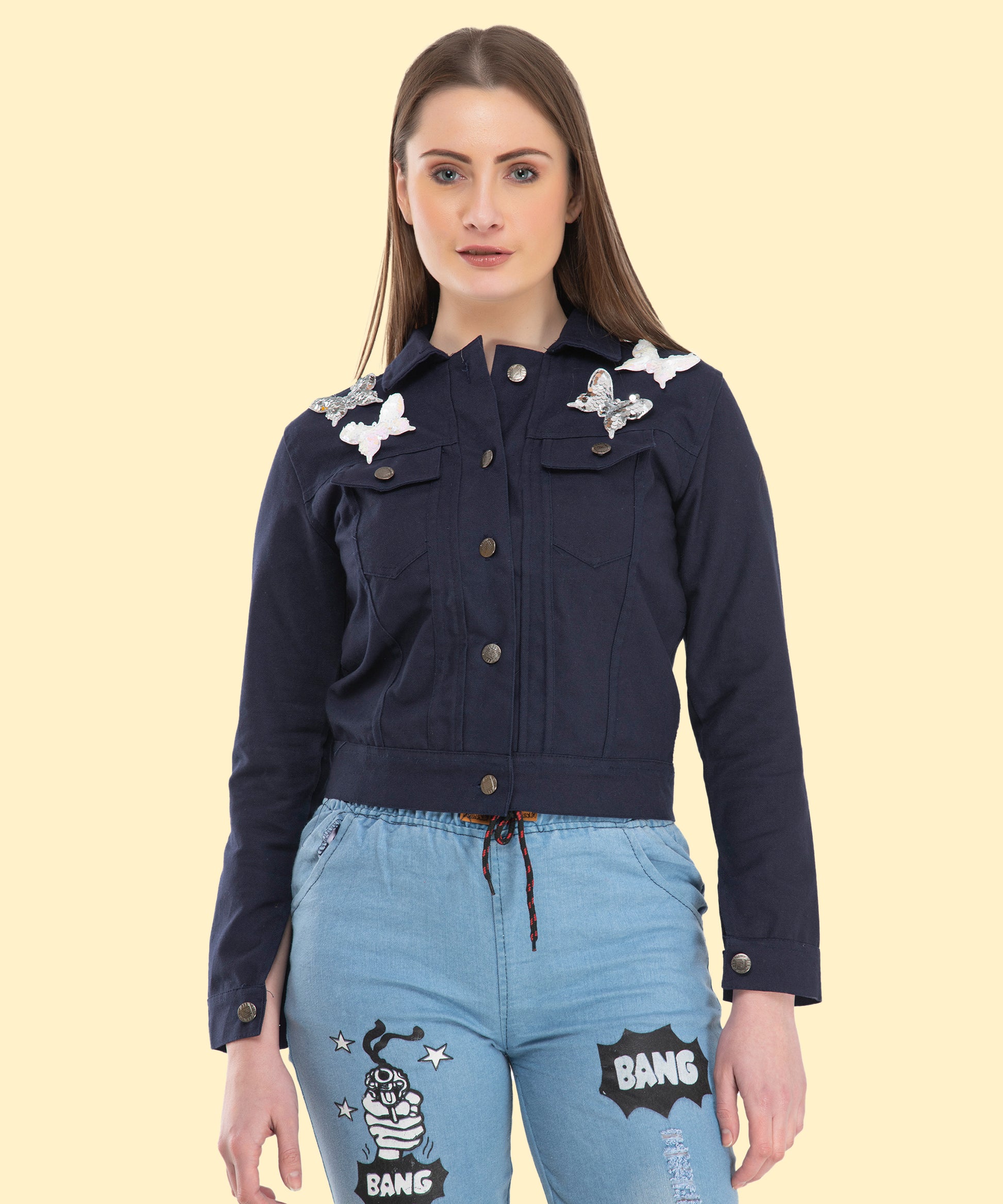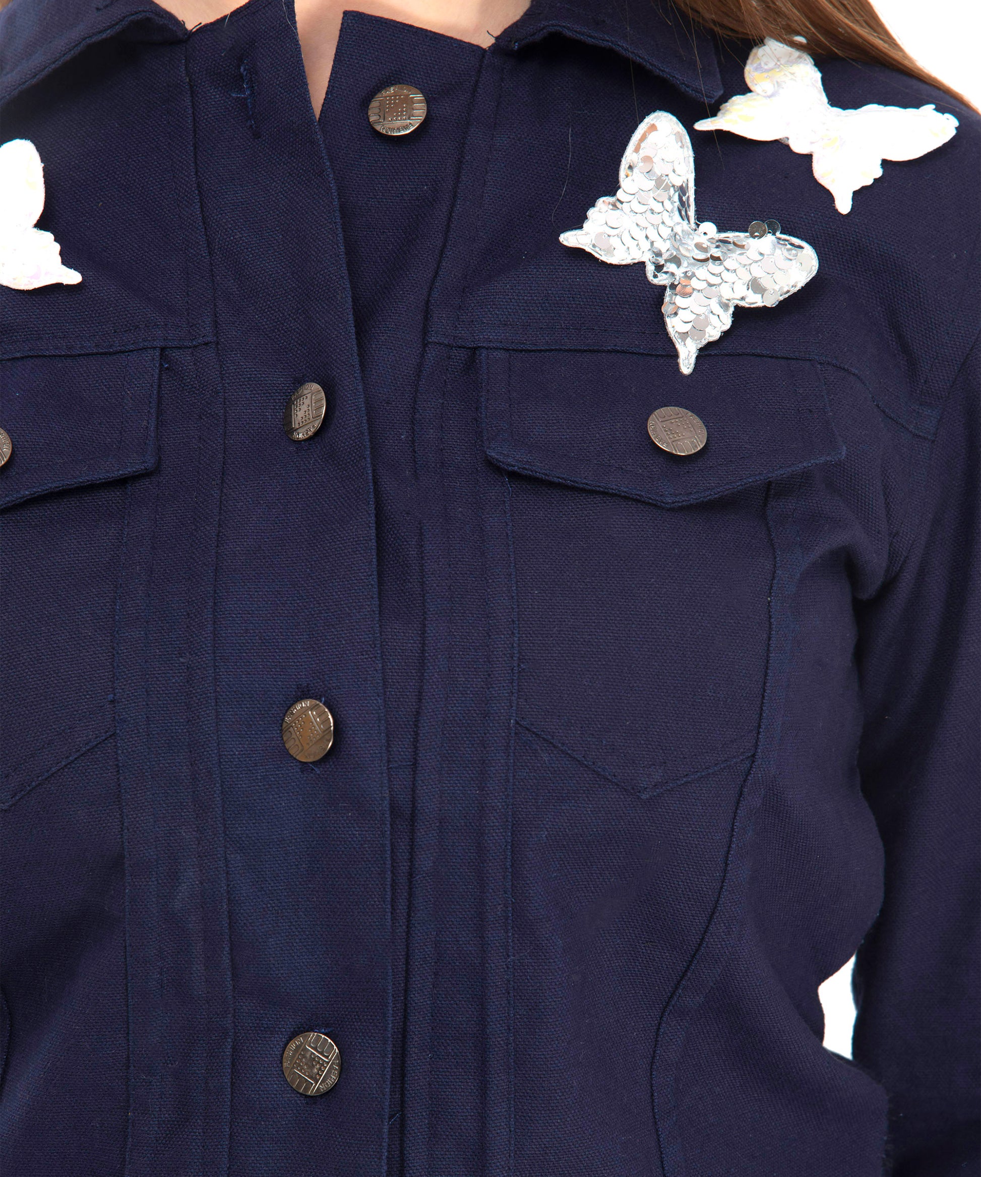 A jacket that brings both grace and personality to your wardrobe.Its deep blue tone pairs effortlessly with light or dark denim. Butterflies on the shoulders create a unique, eye-catching vibe. An ideal piece for women who love stylish yet versatile fashion.