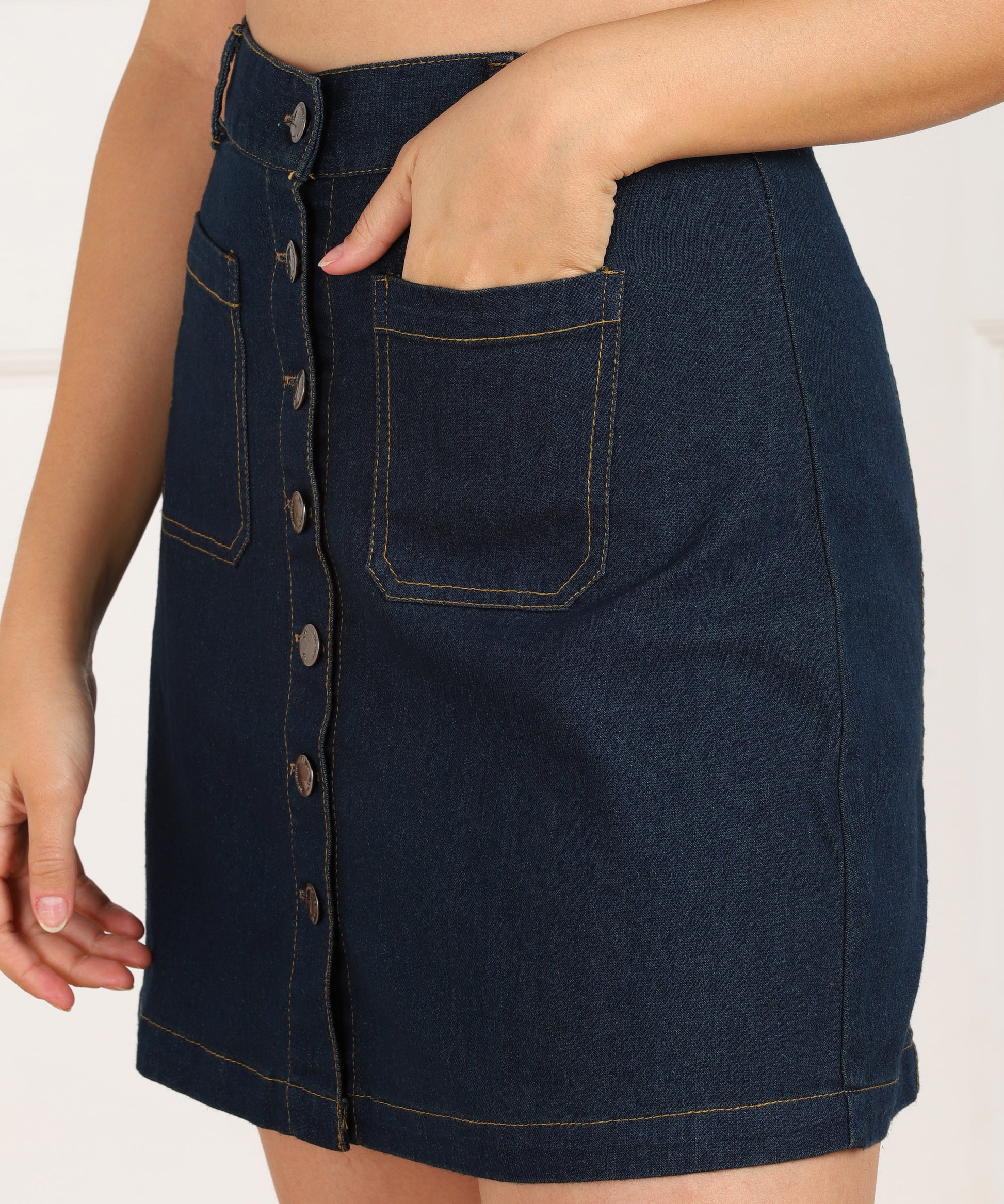 This skirt radiates a confident and refined vibe. Its blue-black wash creates depth and timeless charm. The high-waist fit sculpts a sleek and feminine silhouette. A must-have piece for every modern wardrobe.