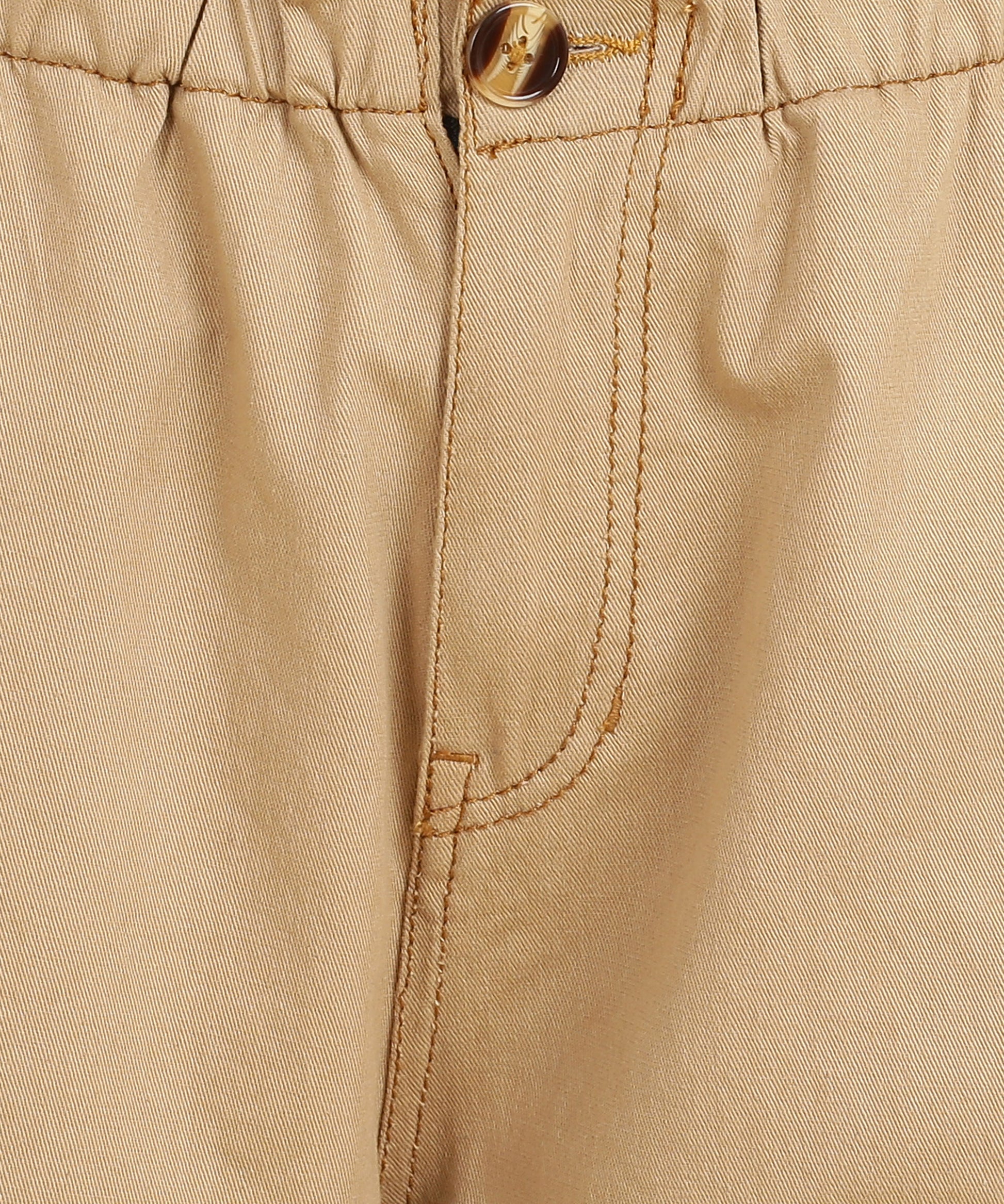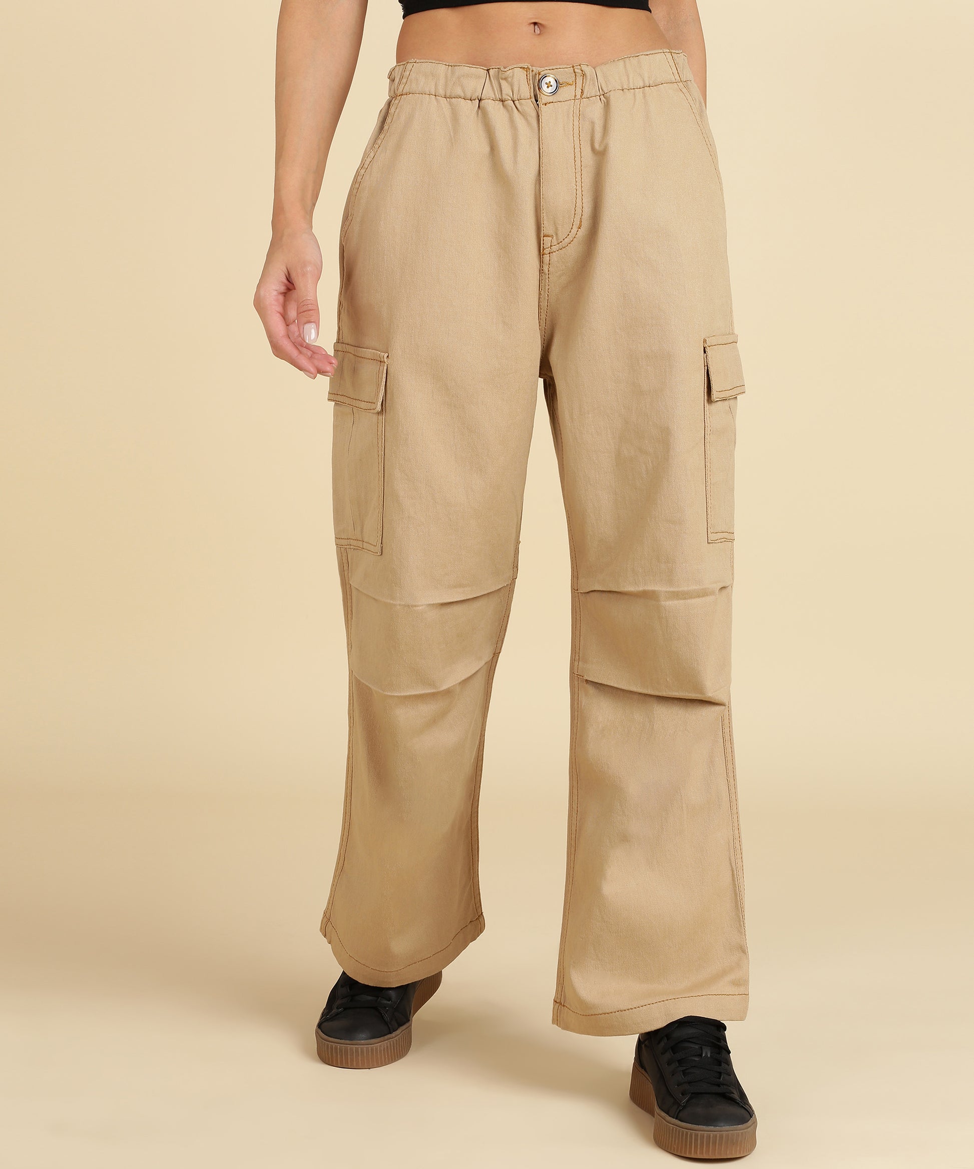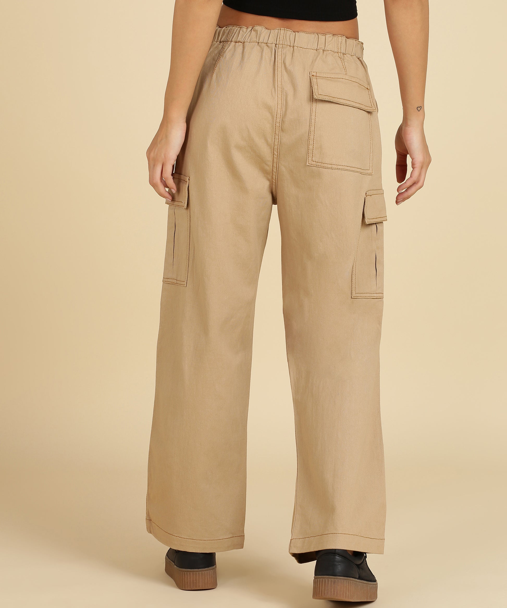 Crafted from durable fabric, these beige cargos redefine everyday wear. The mid-rise fit with elastic waistband ensures day-long comfort. Side flap pockets enhance utility while keeping it chic and minimal. Pair with sneakers or boots for a timeless, versatile look.