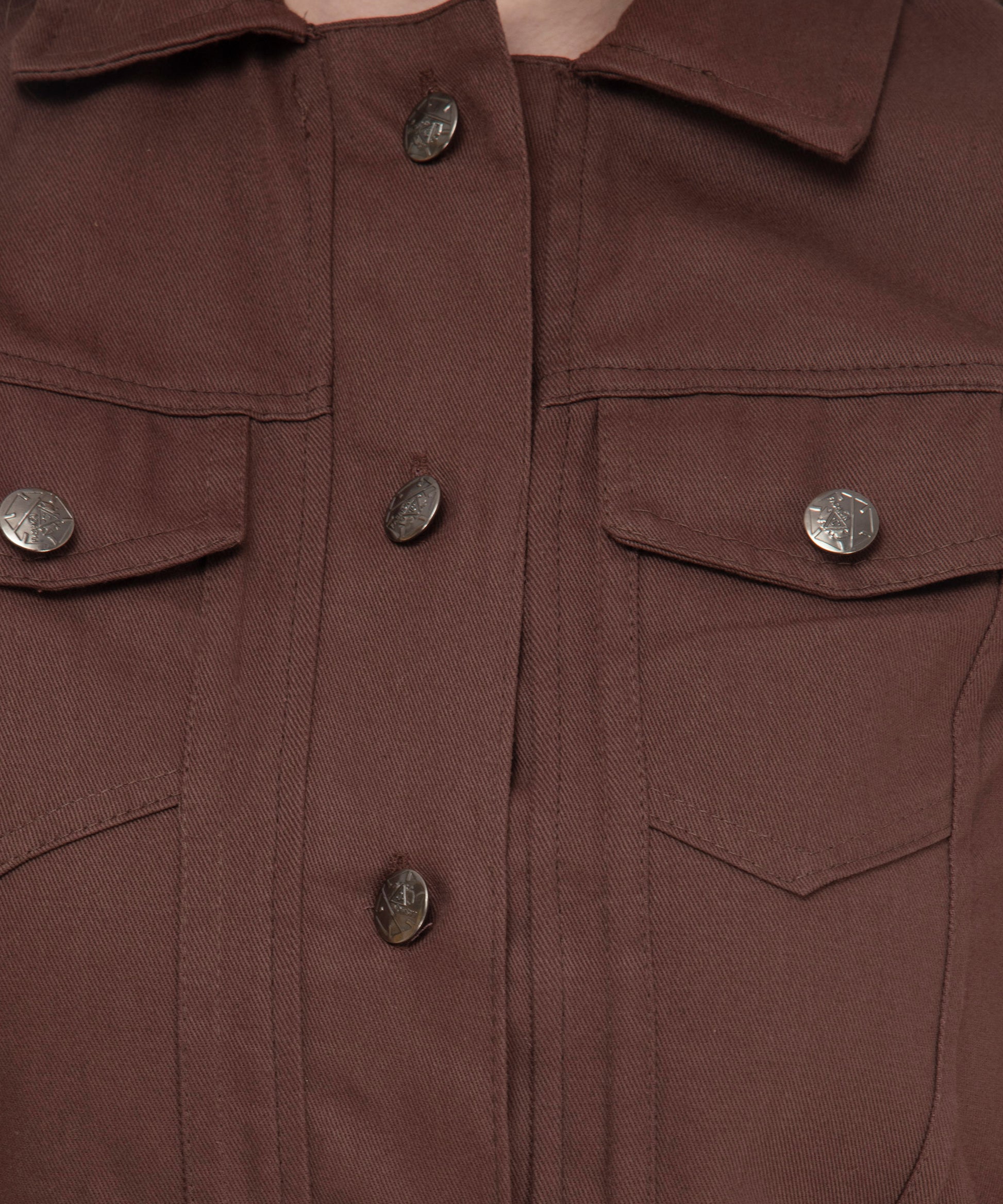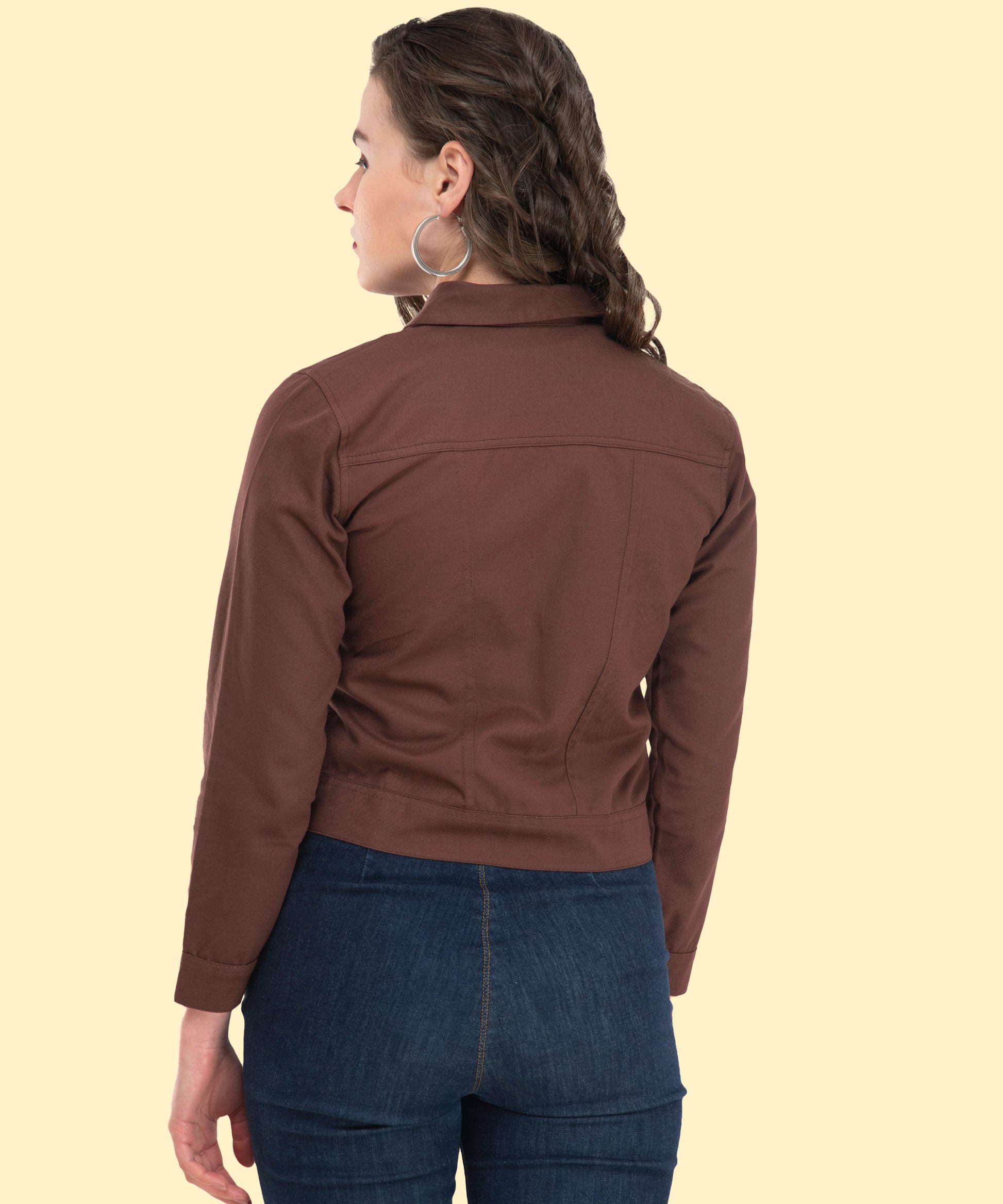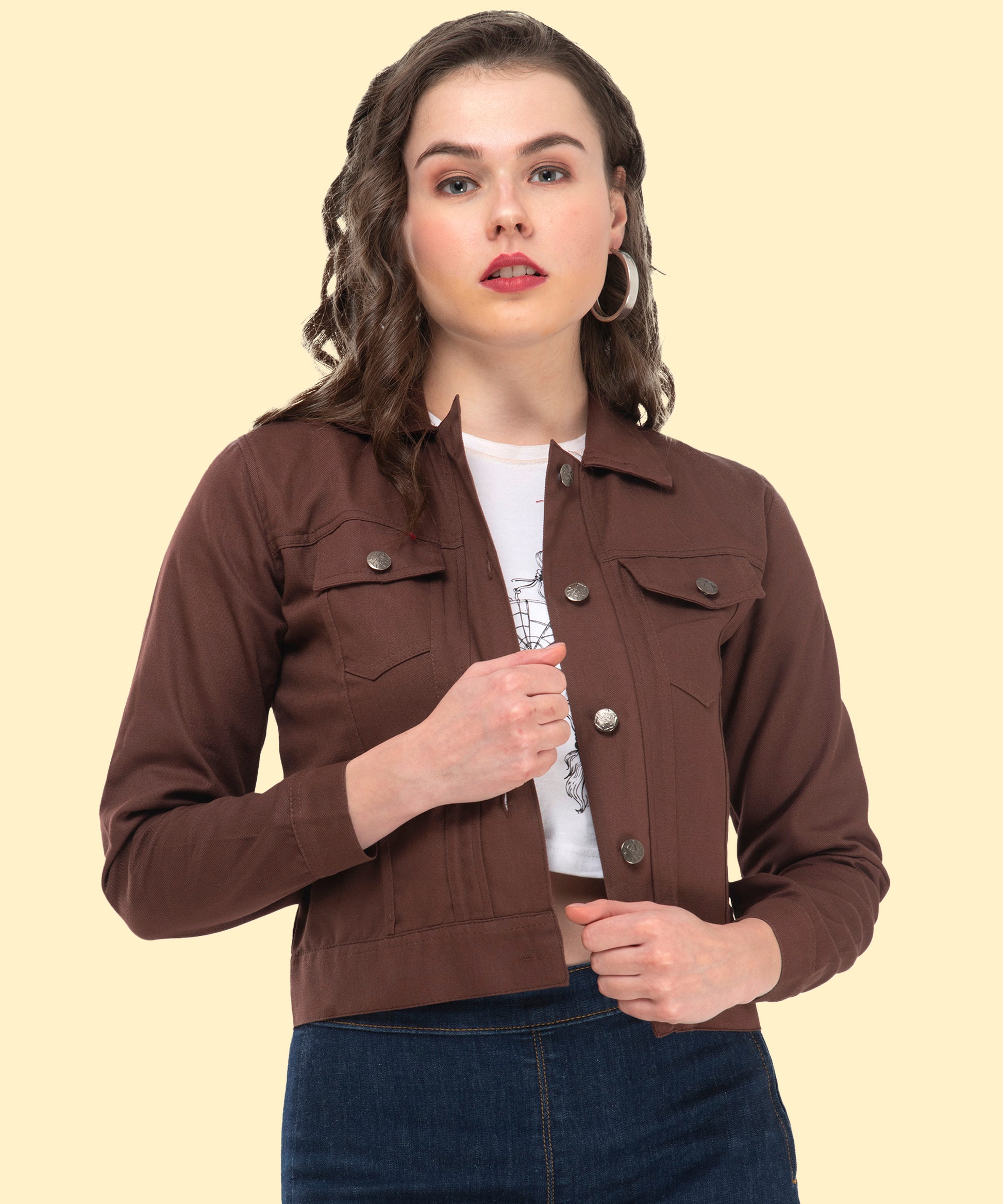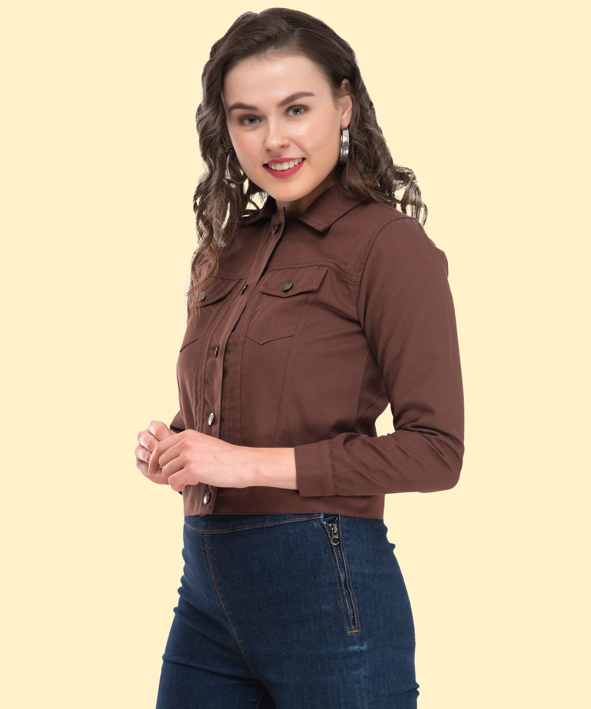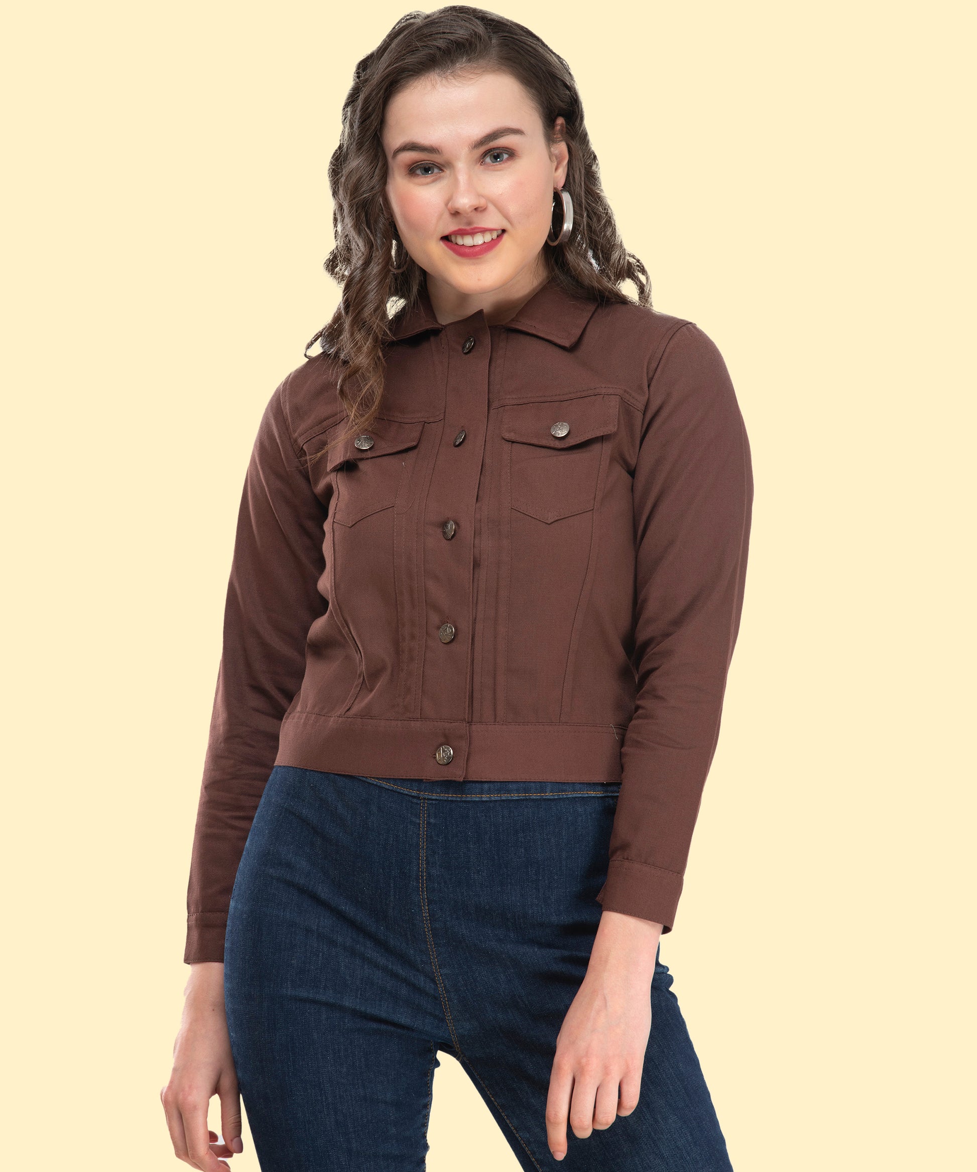 A wardrobe essential for every fashion-forward woman. This brown cropped jacket is designed to give casual elegance. The full sleeves and metal button detailing add a polished look.Perfect for brunch, office outings, or weekend adventures.