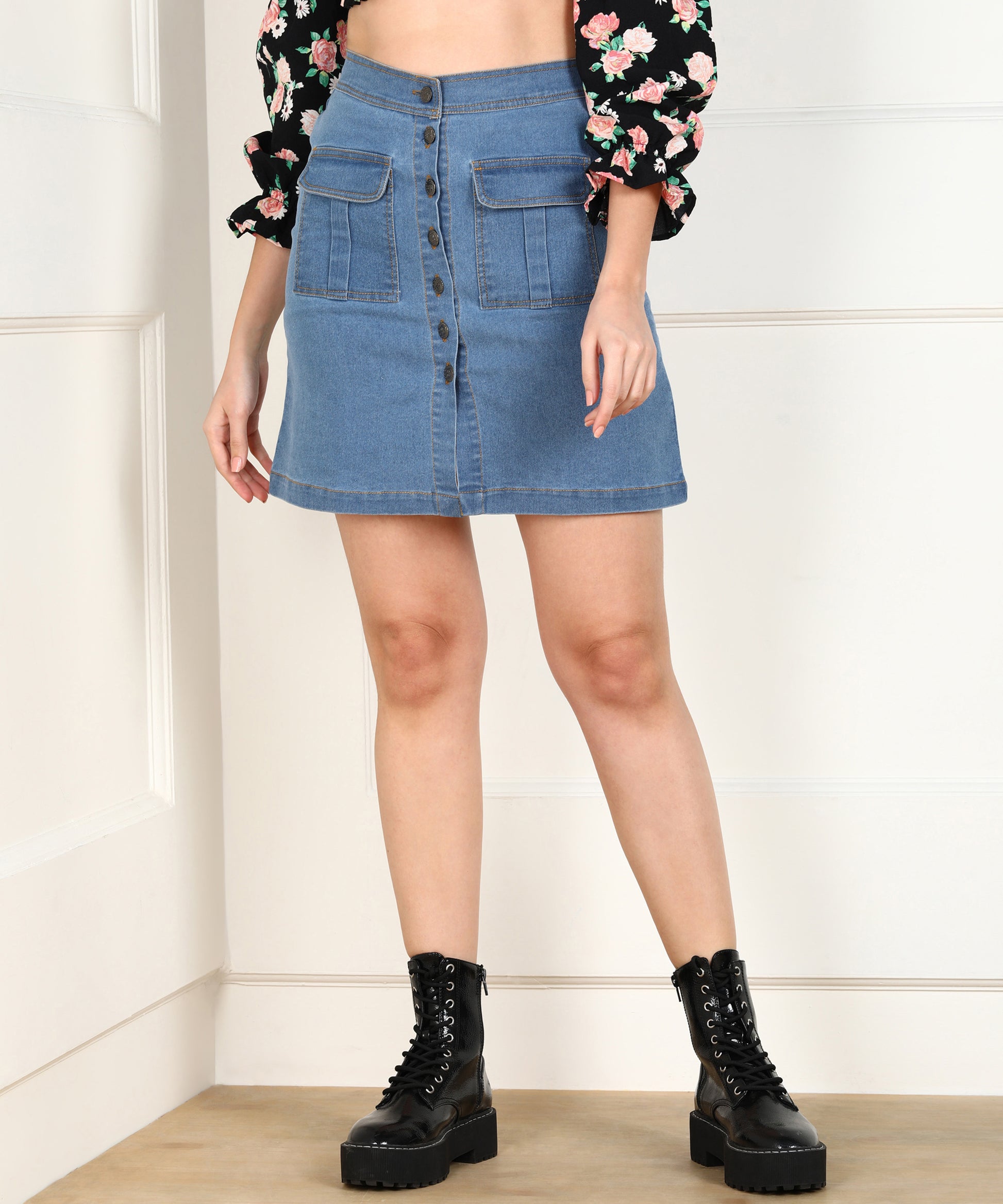 Minimalism meets modern style in this piece. The soft blue tone adds freshness and versatility.A neat hemline ensures sophistication in details.It’s denim reimagined for today’s chic woman.