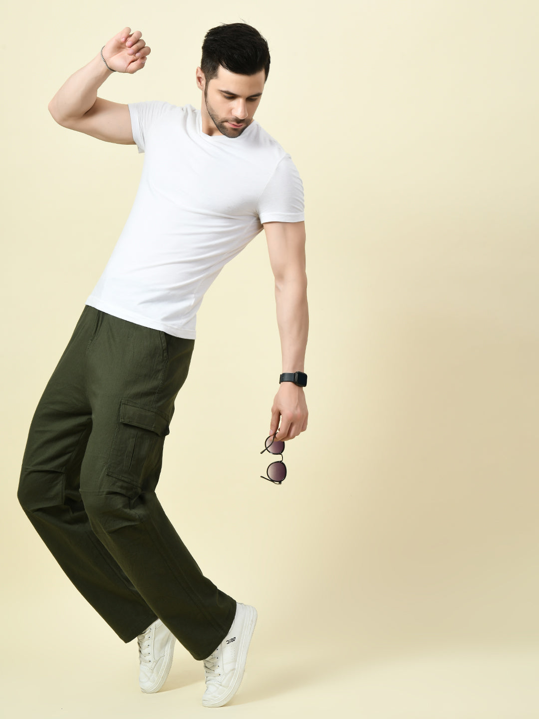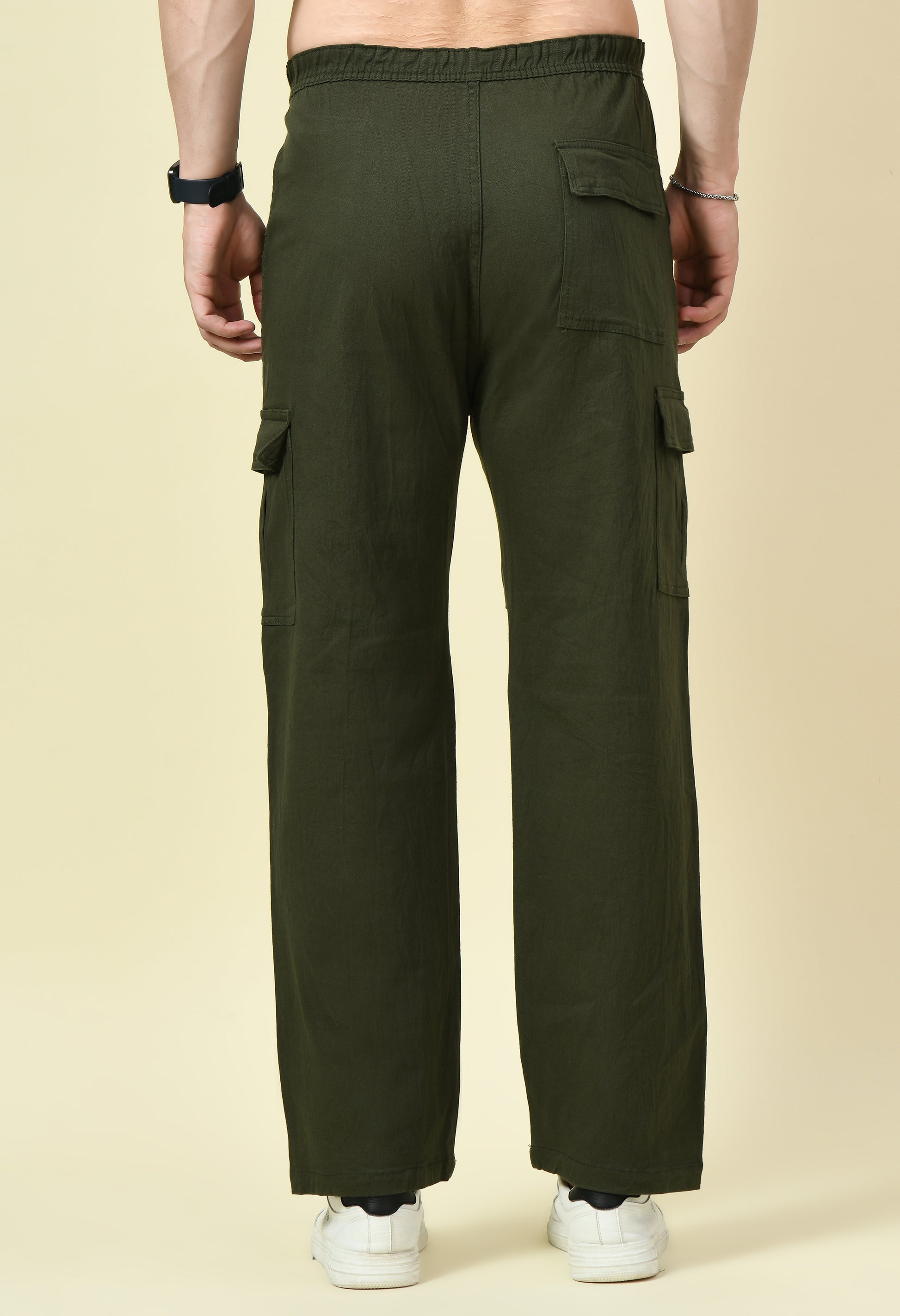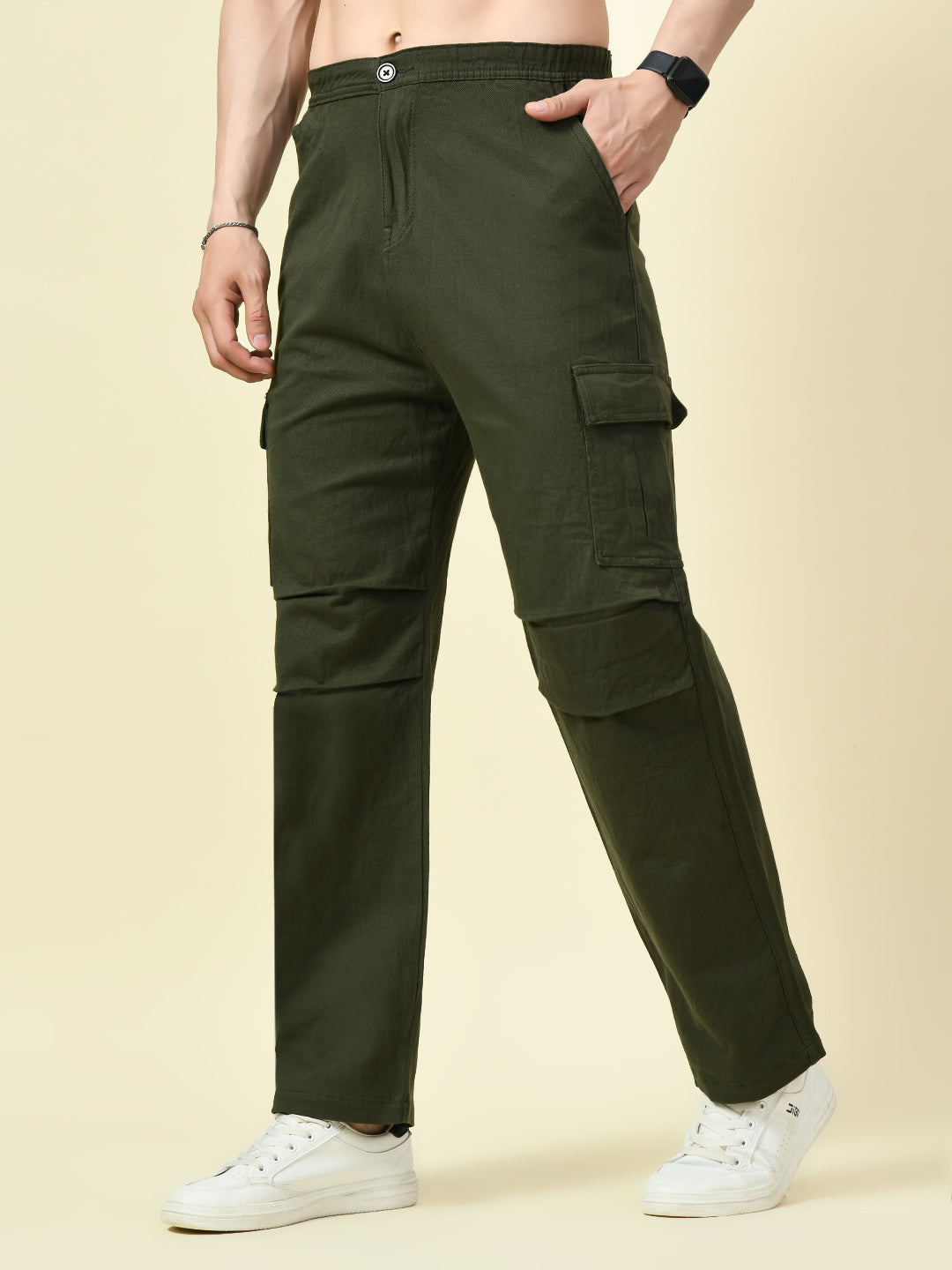 Olive green cargo pants that balance fashion and function.Made to handle outdoor treks and urban outings.Six roomy pockets for your everyday essentials.Designed for all-day wear without sacrificing comfort.