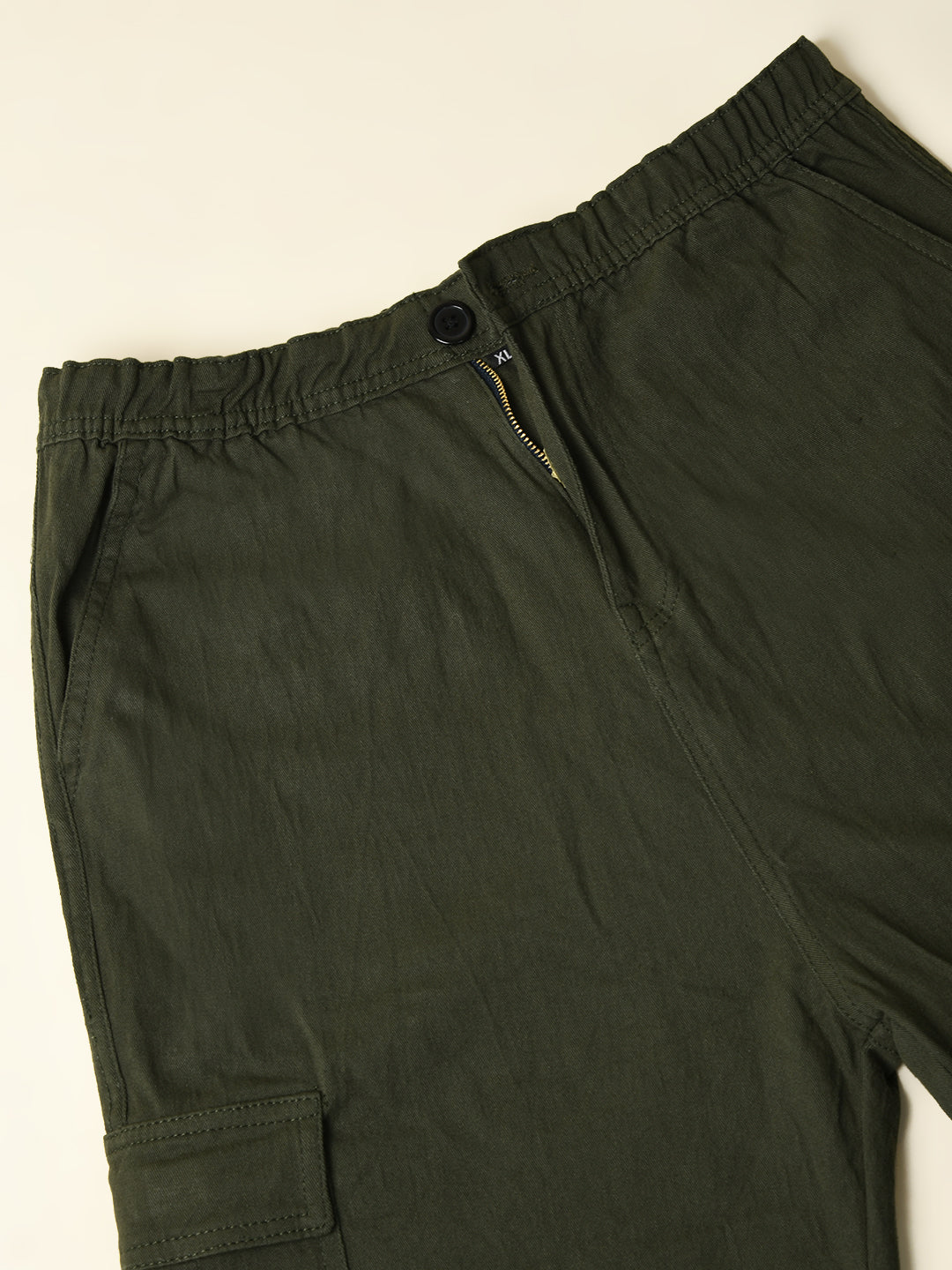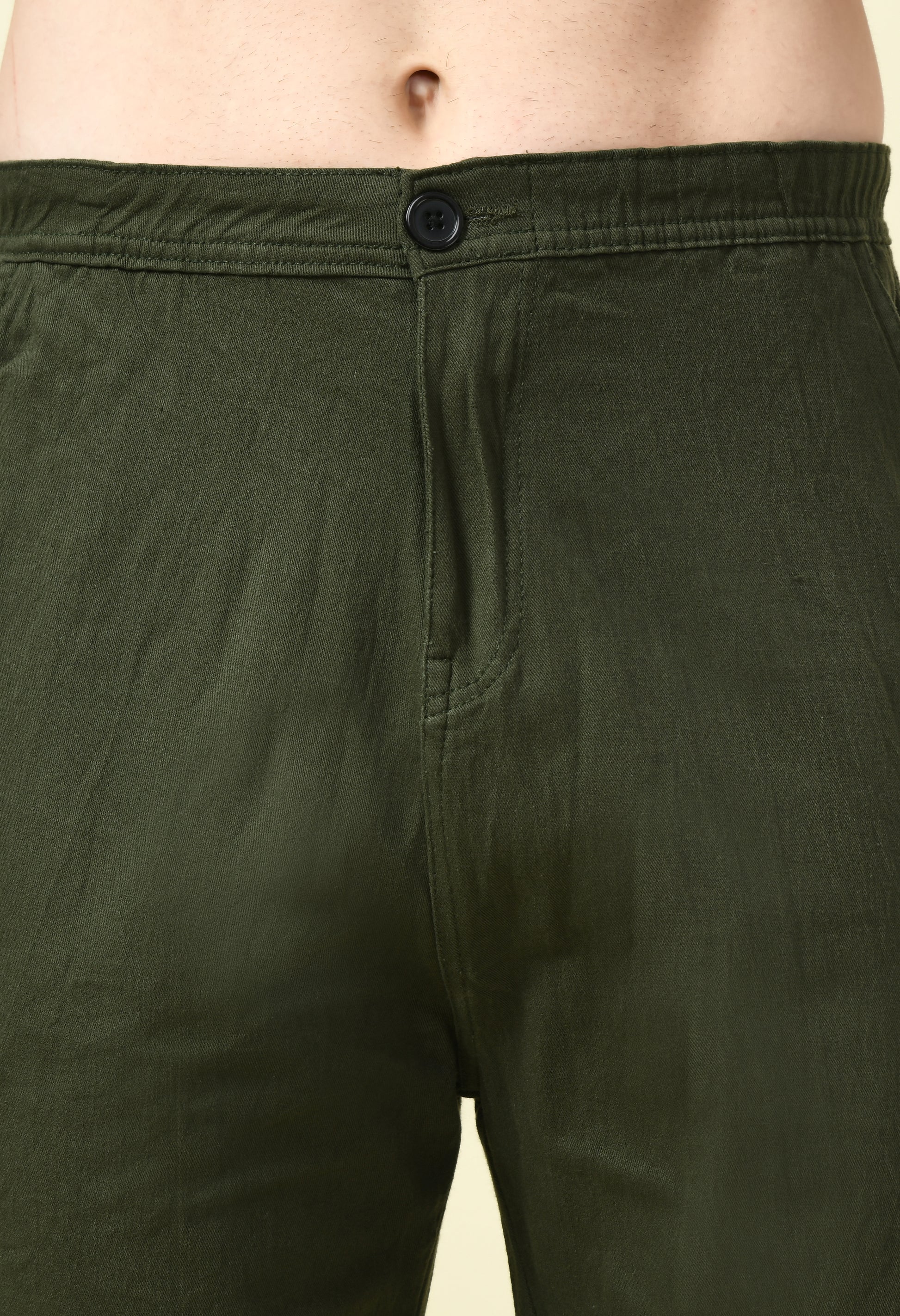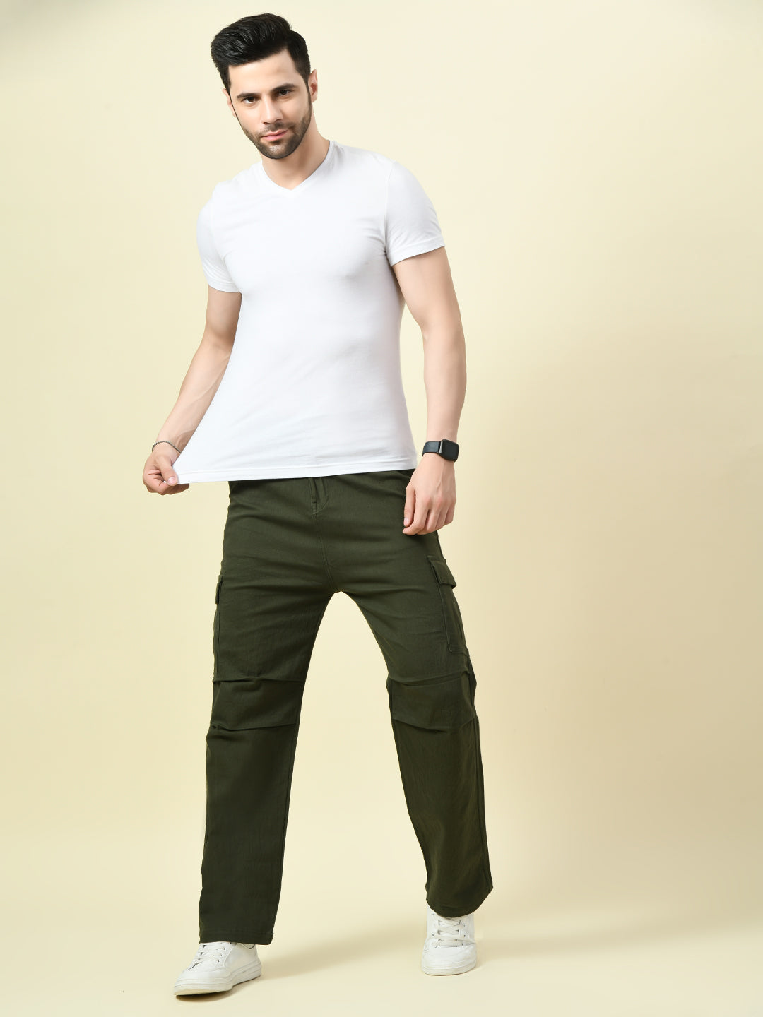 Olive green cargo pants that balance fashion and function.Made to handle outdoor treks and urban outings.Six roomy pockets for your everyday essentials.Designed for all-day wear without sacrificing comfort.
