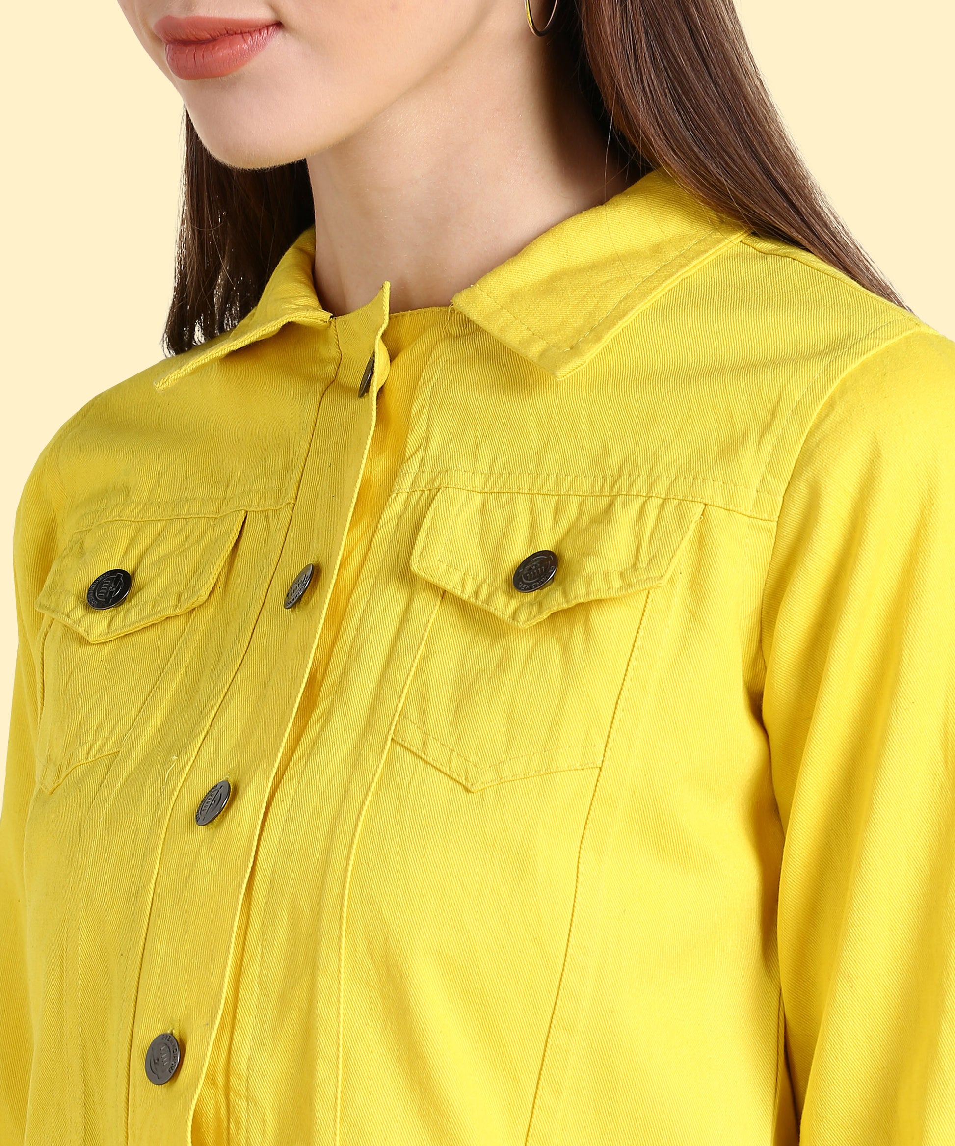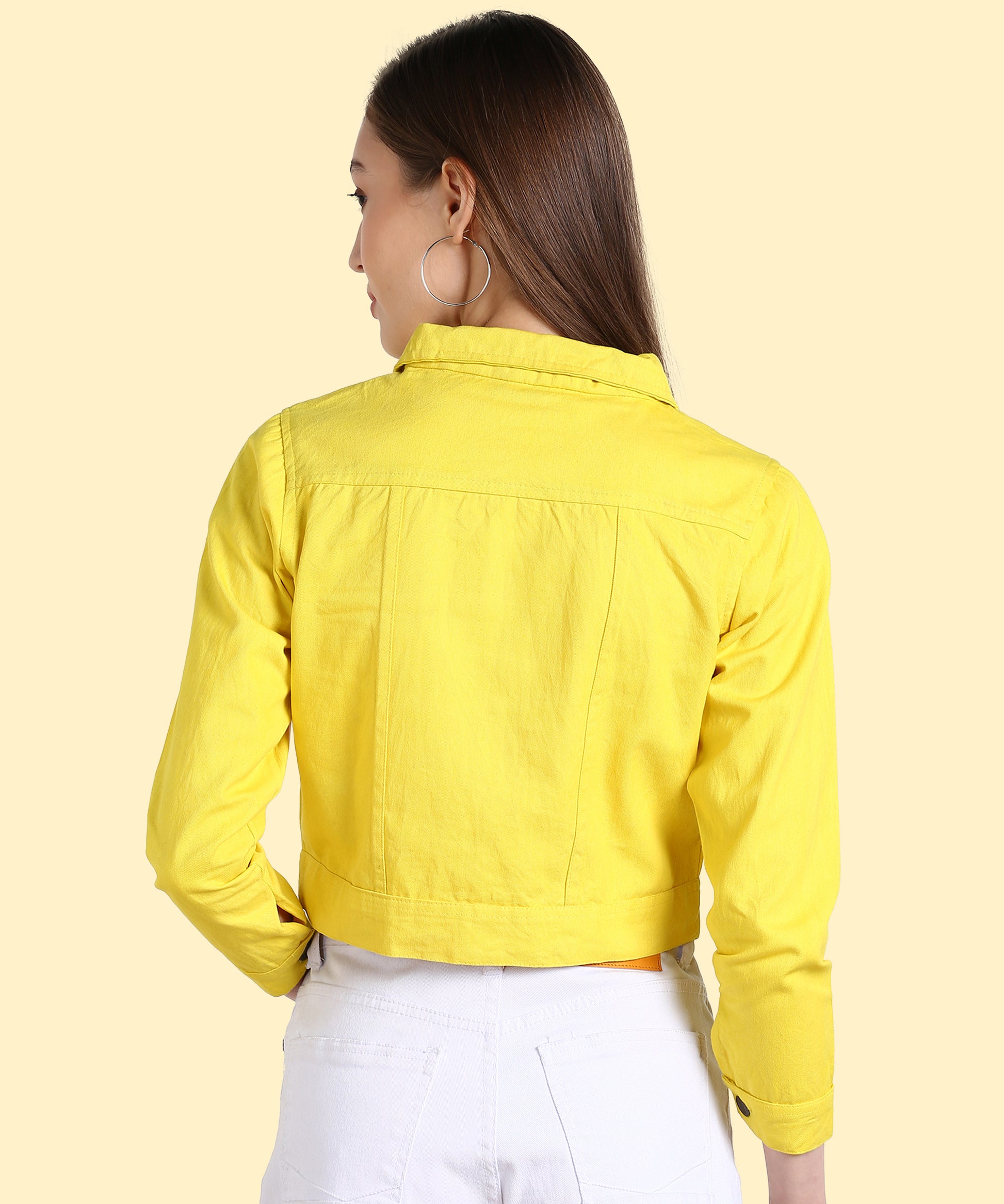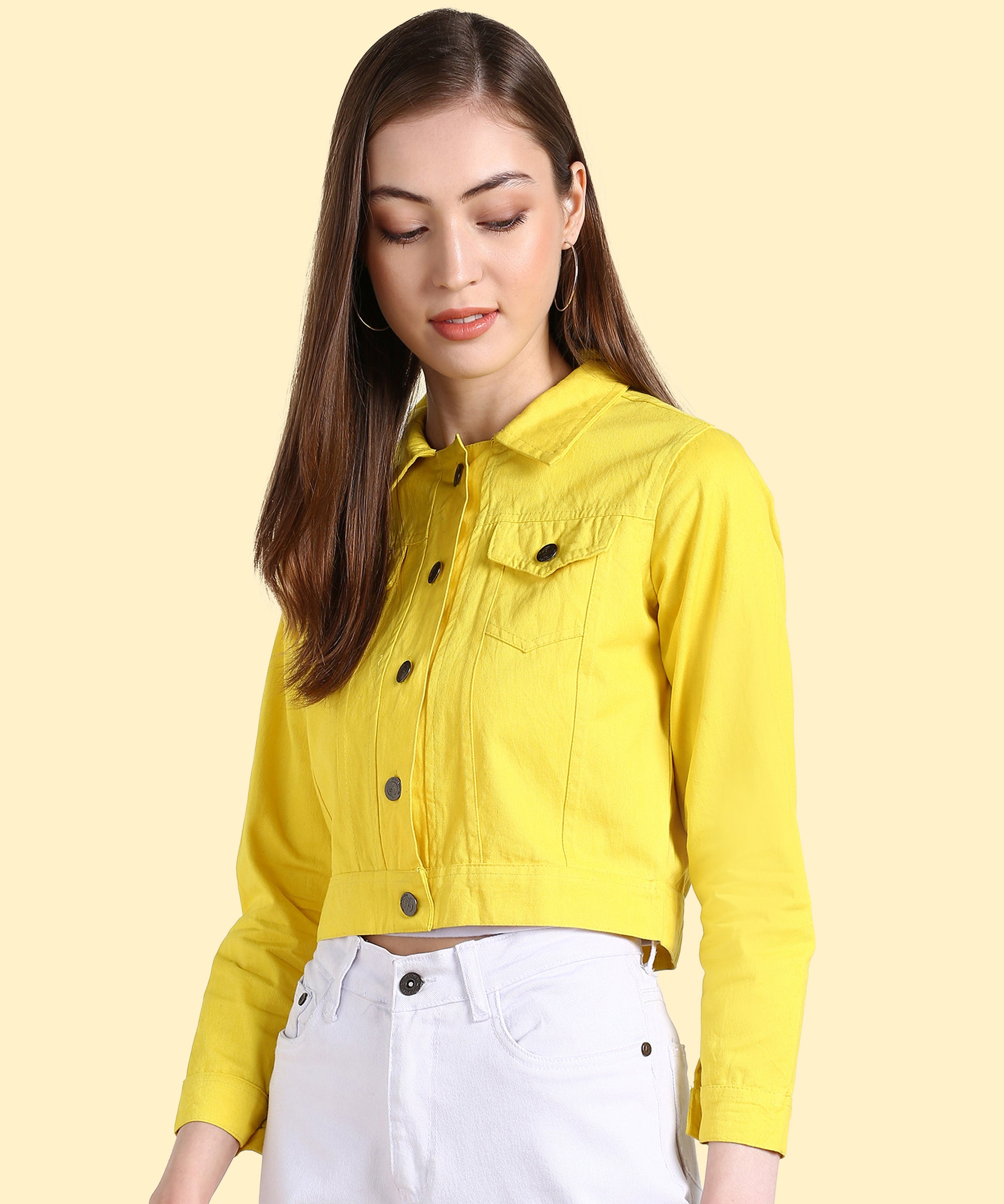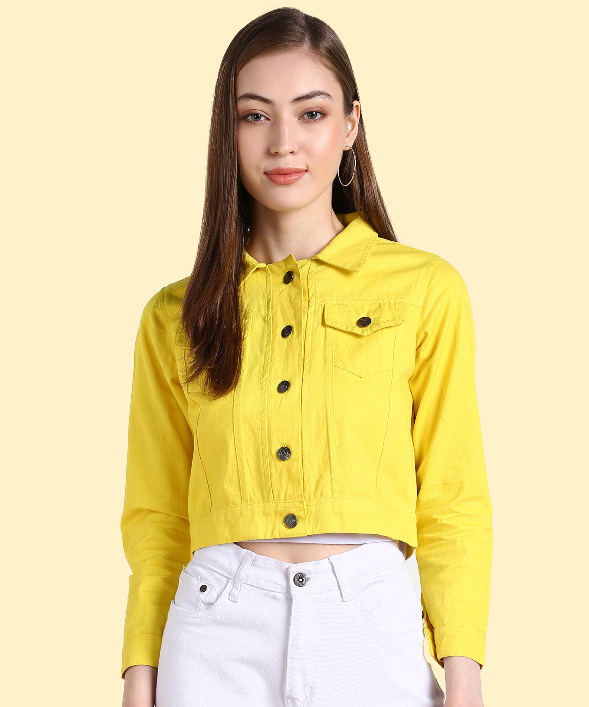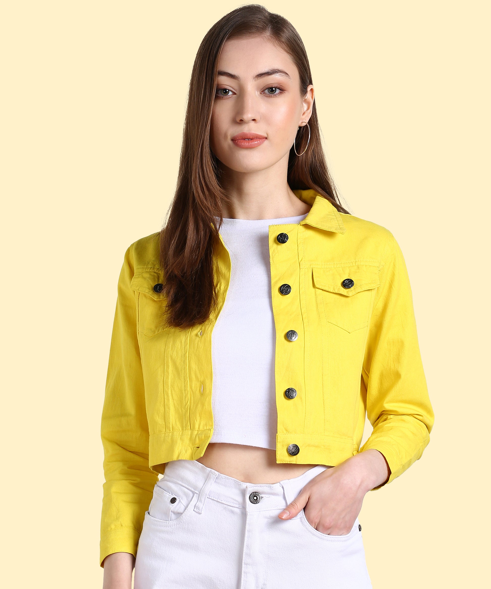 Bring sunshine to your outfit with this radiant neon yellow jacket. Its cropped length flatters the waistline, giving you a chic silhouette. Front button closure and flap pockets enhance its casual denim-inspired appeal. Pair it with jeans, skirts, or shorts to create endless stylish looks.