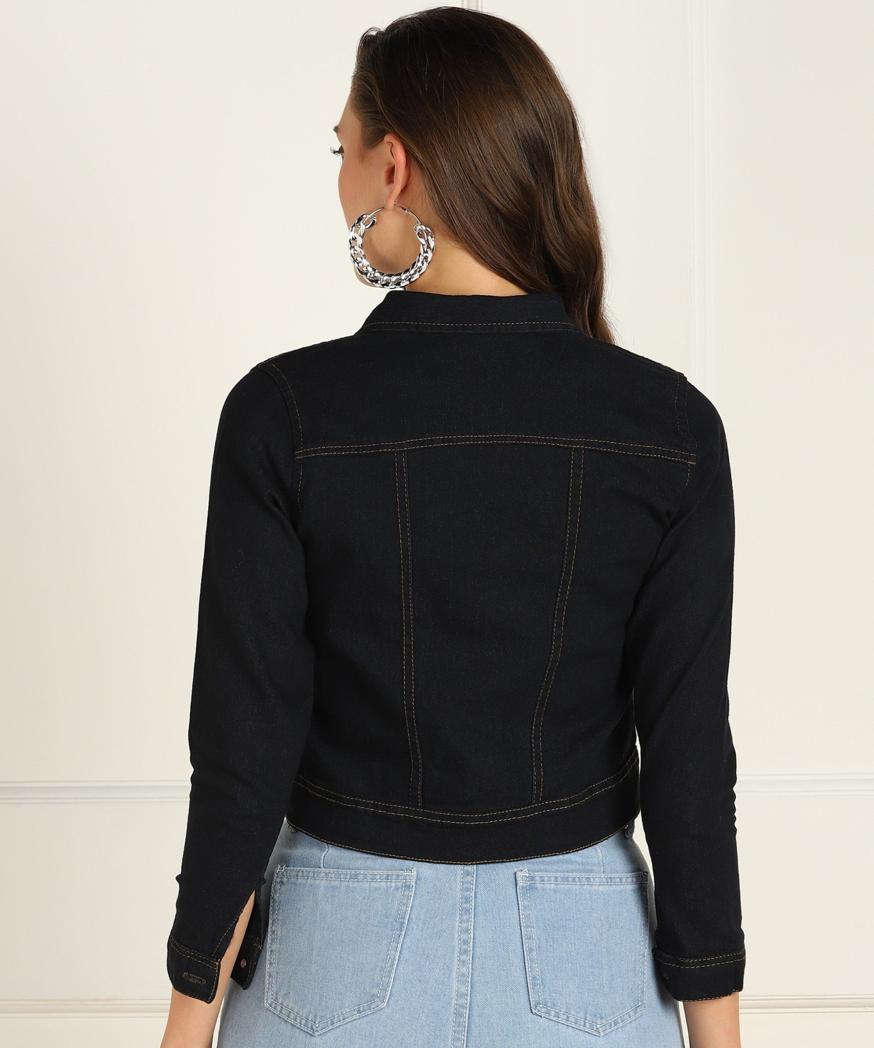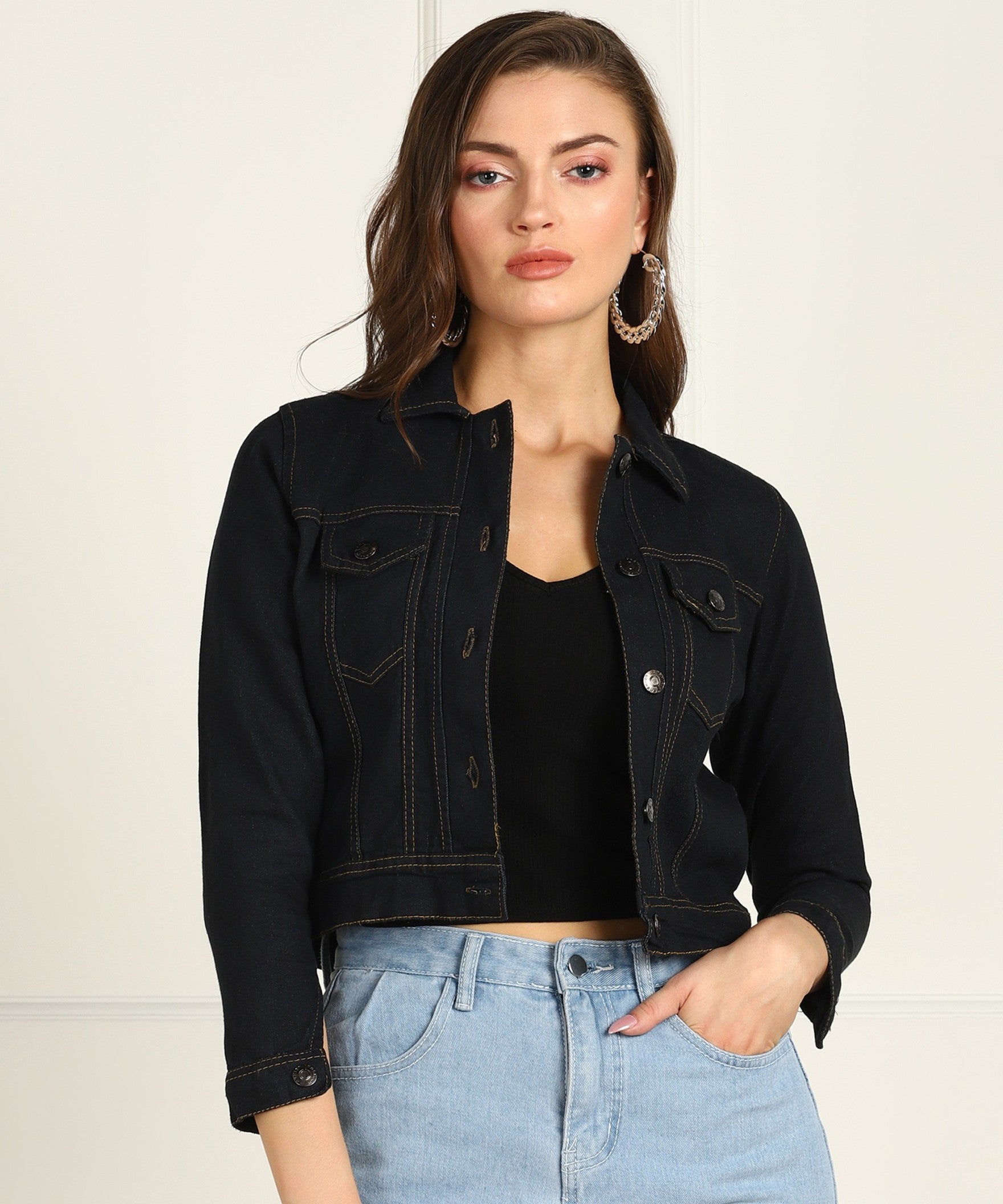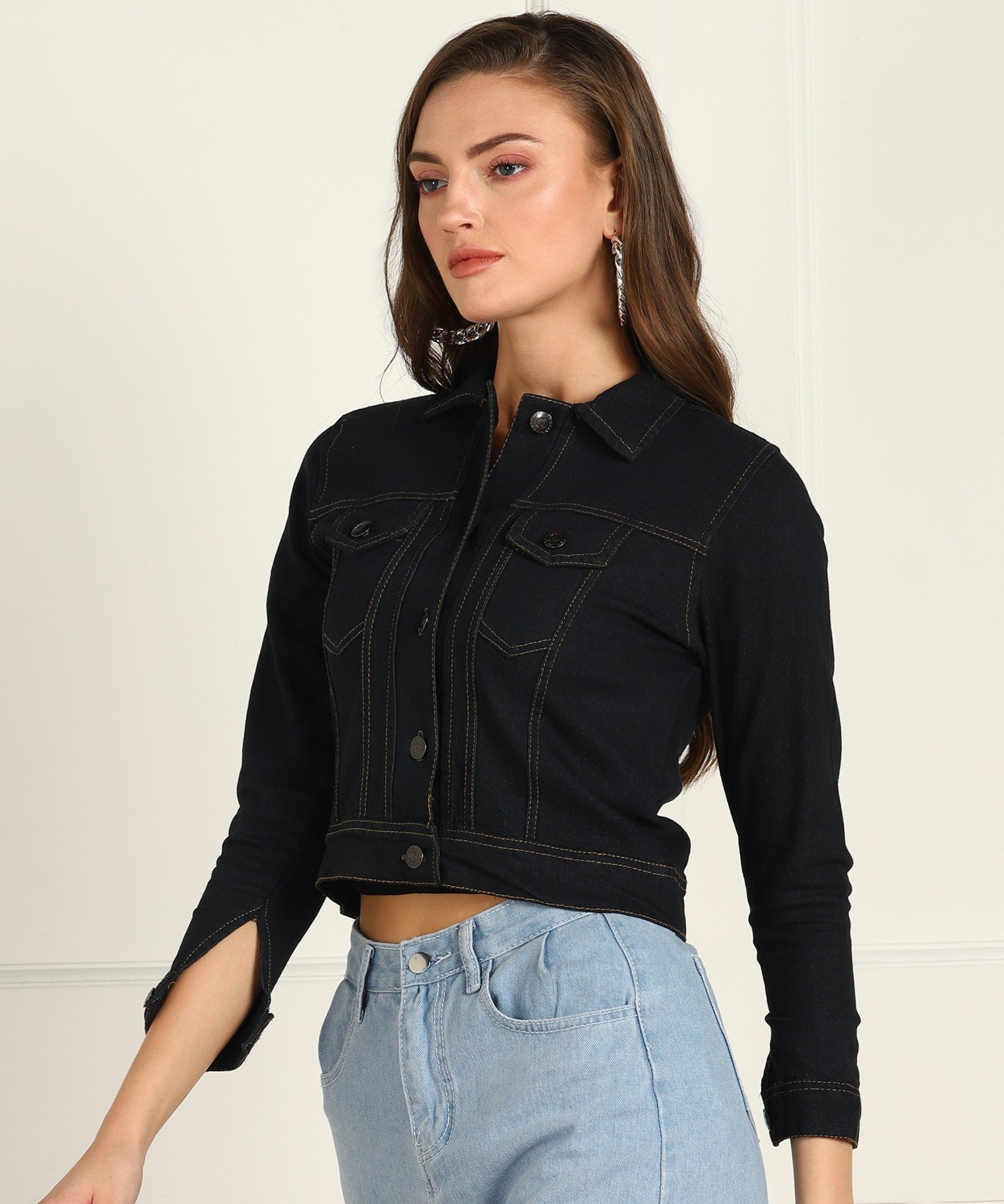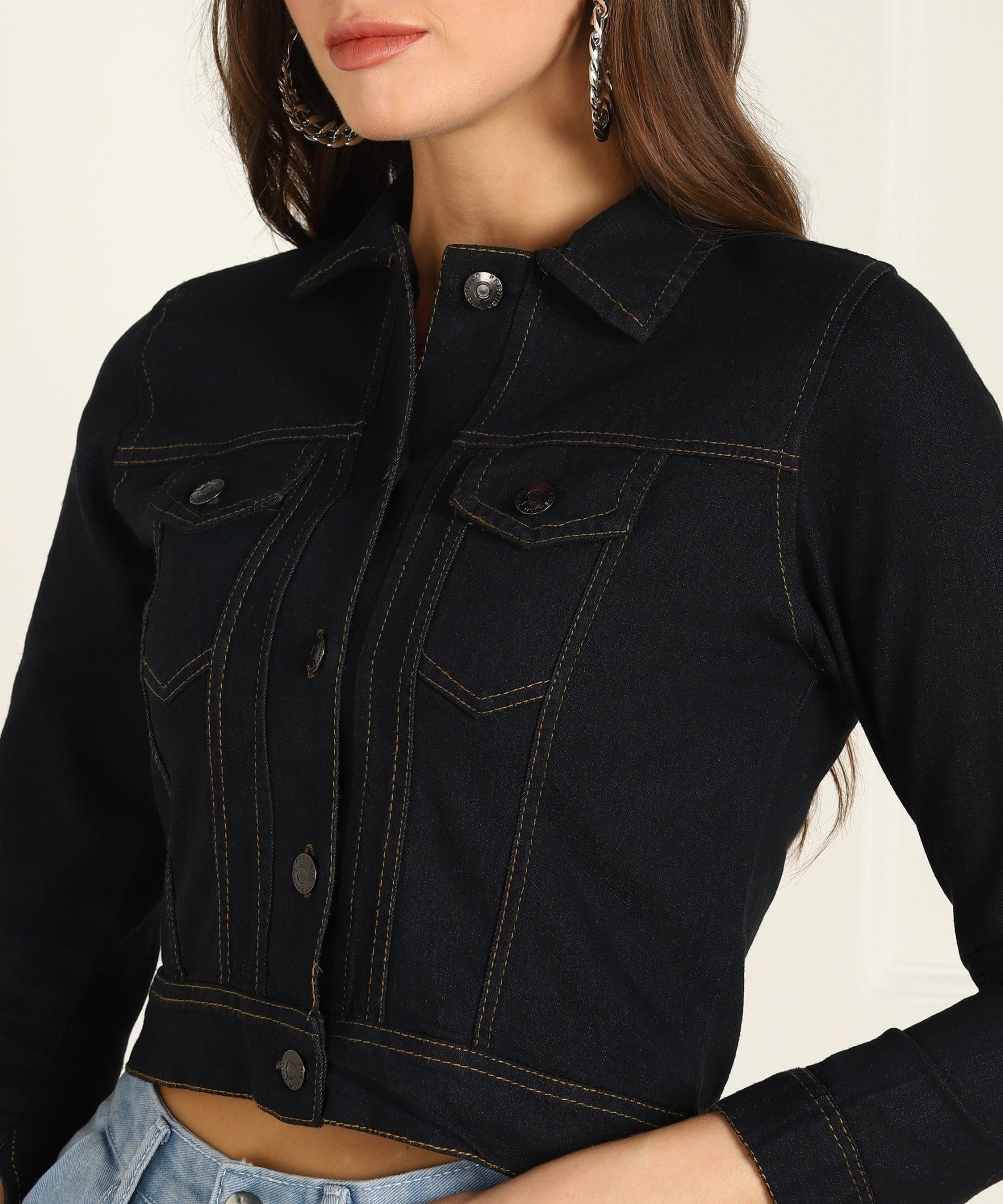 Classic denim with a modern flair – that’s this cropped beauty. The jet-black finish adds depth and elegance to your wardrobe.Button-down detailing creates a perfect blend of chic and casual.Pair it with skirts, jeans, or dresses for endless styling.