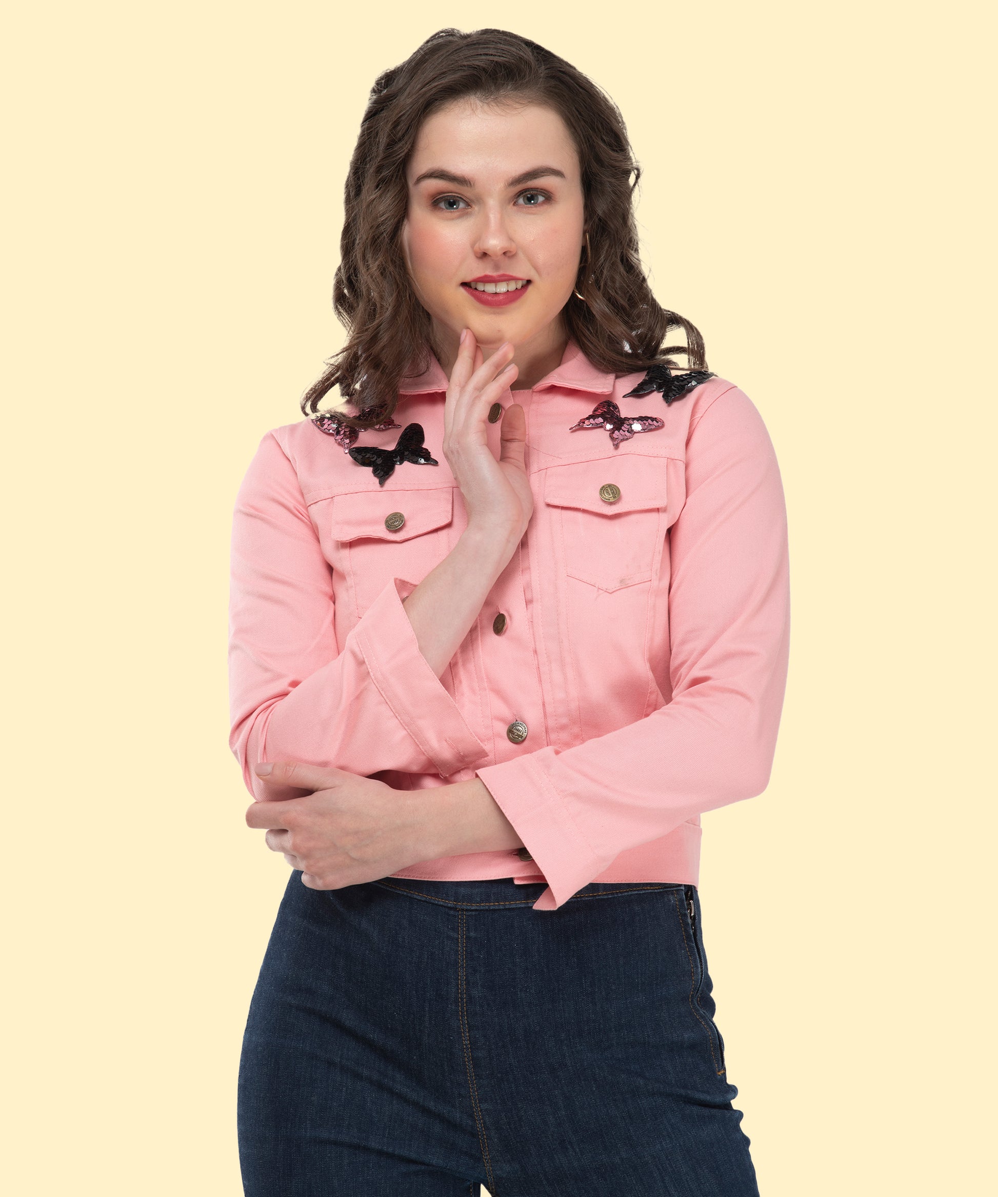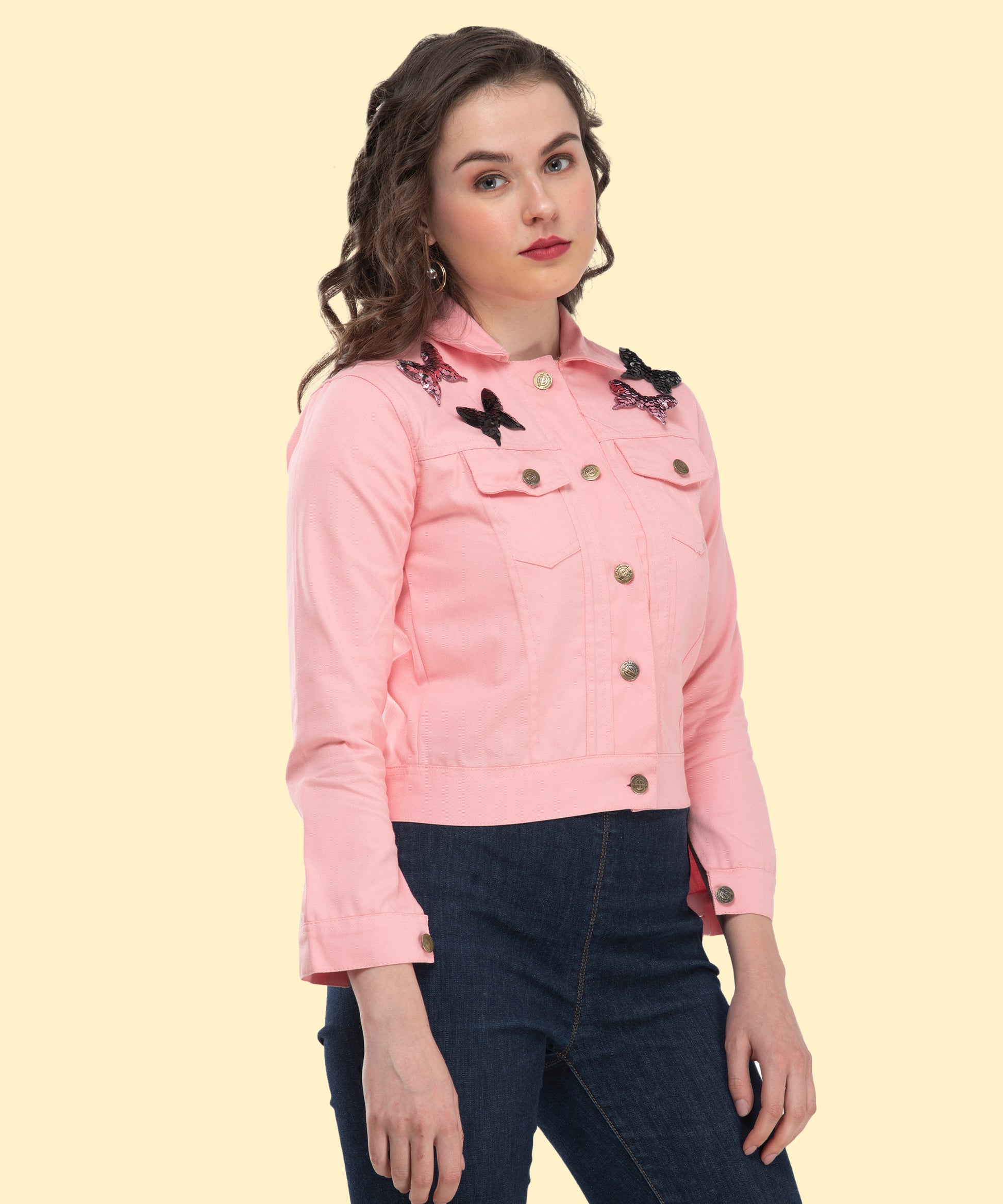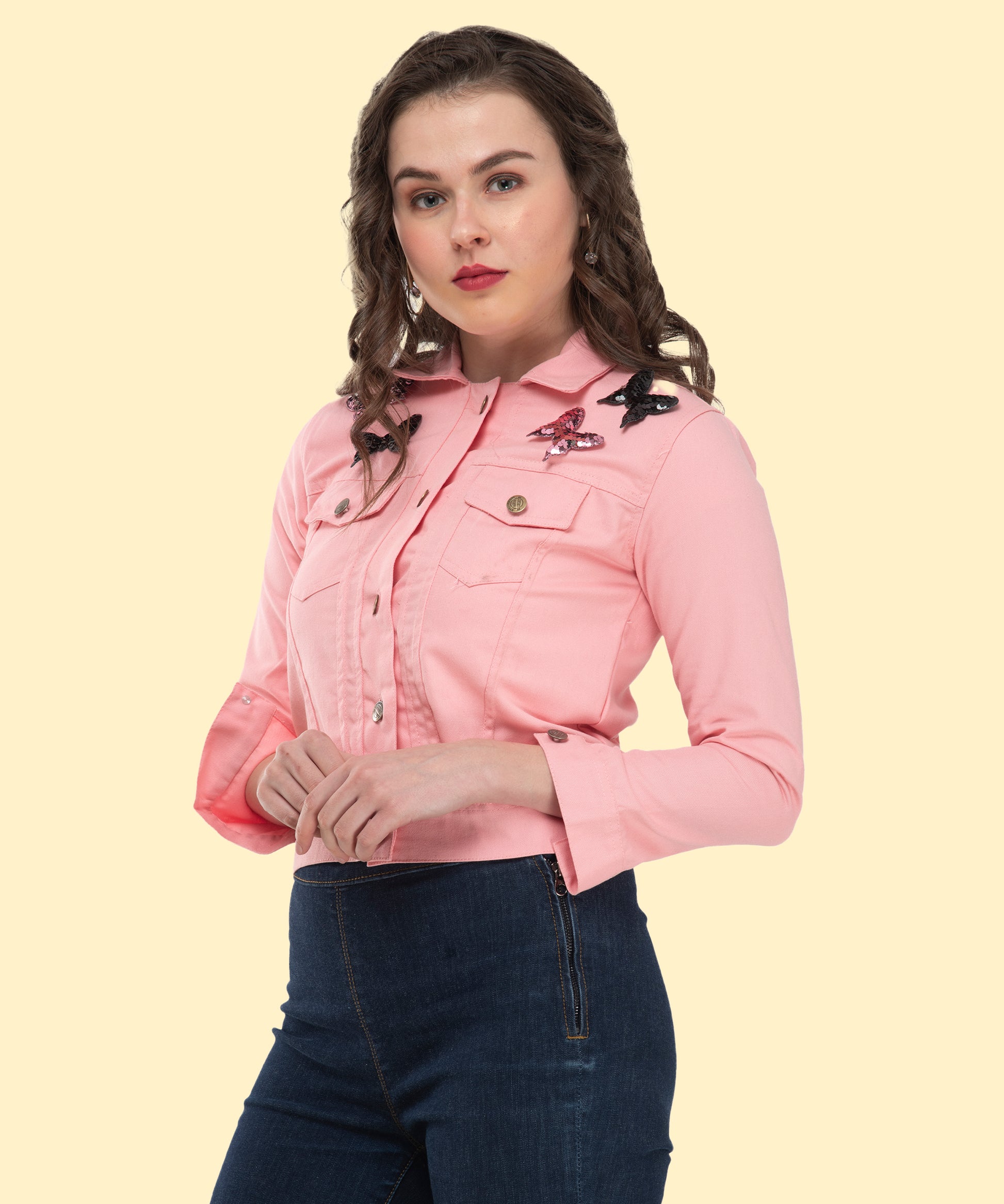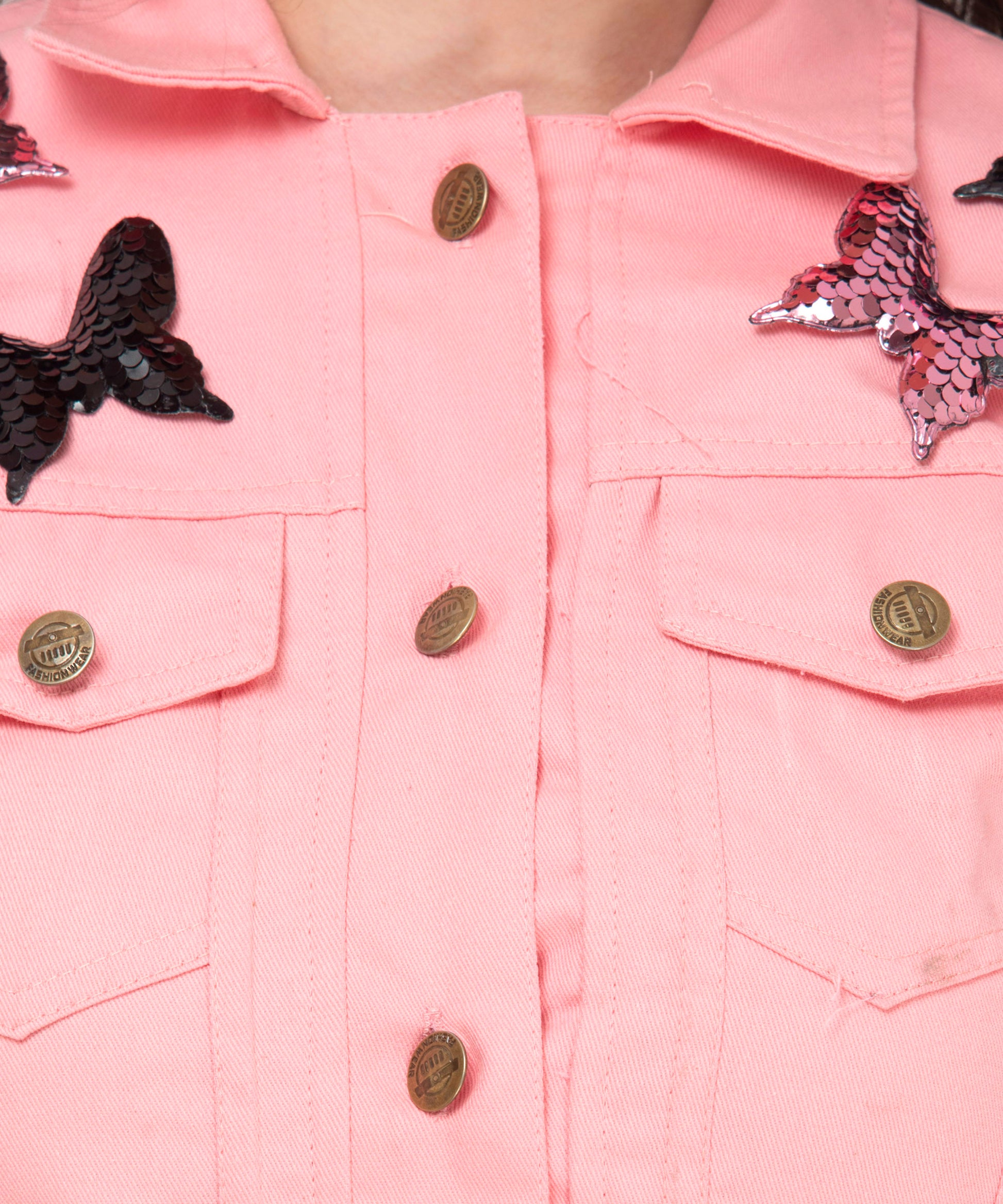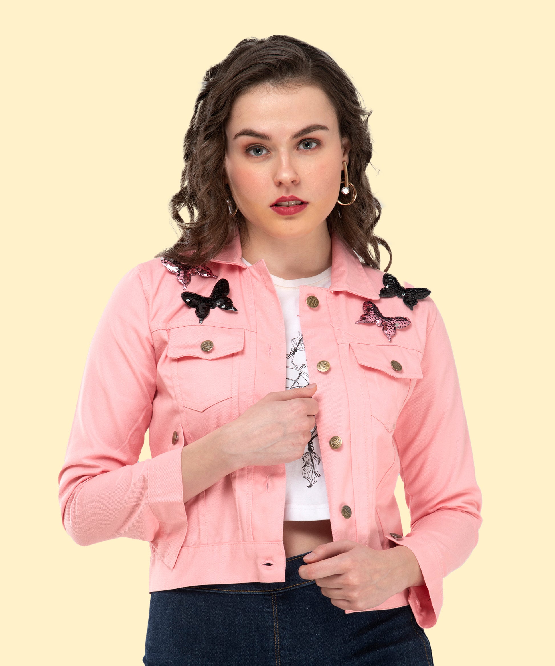 Turn everyday dressing into a statement with this jacket.The elegant pink shade exudes confidence and grace.Utility-inspired pockets meet playful embroidered butterflies.Stay comfortable while looking fashion-forward all day long.