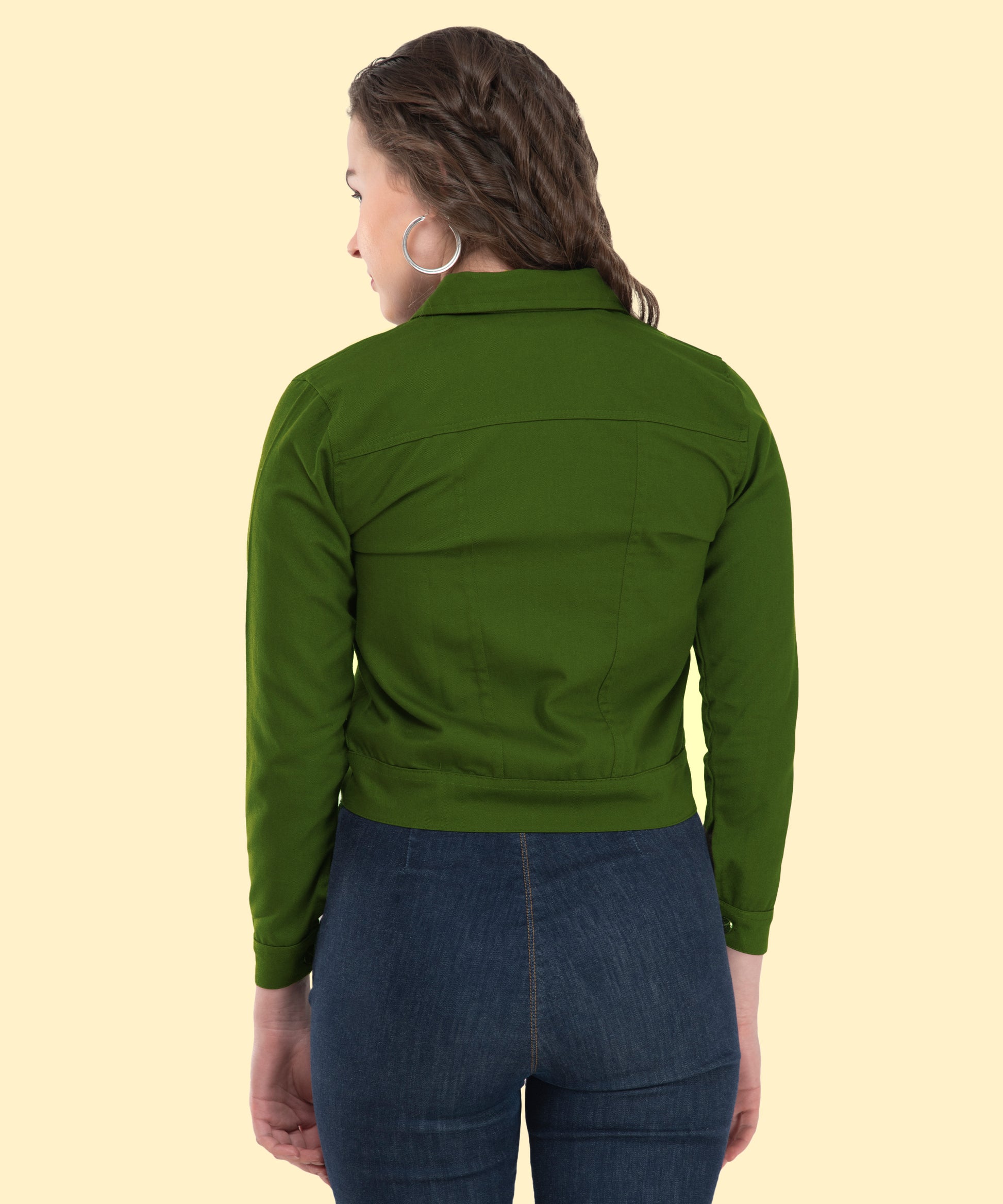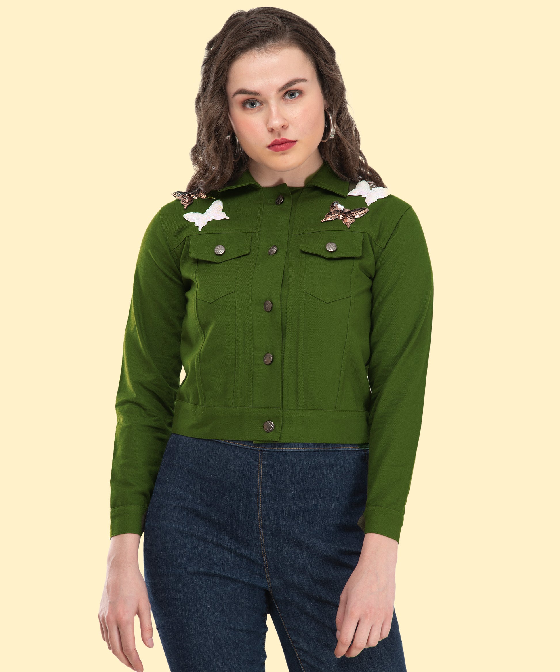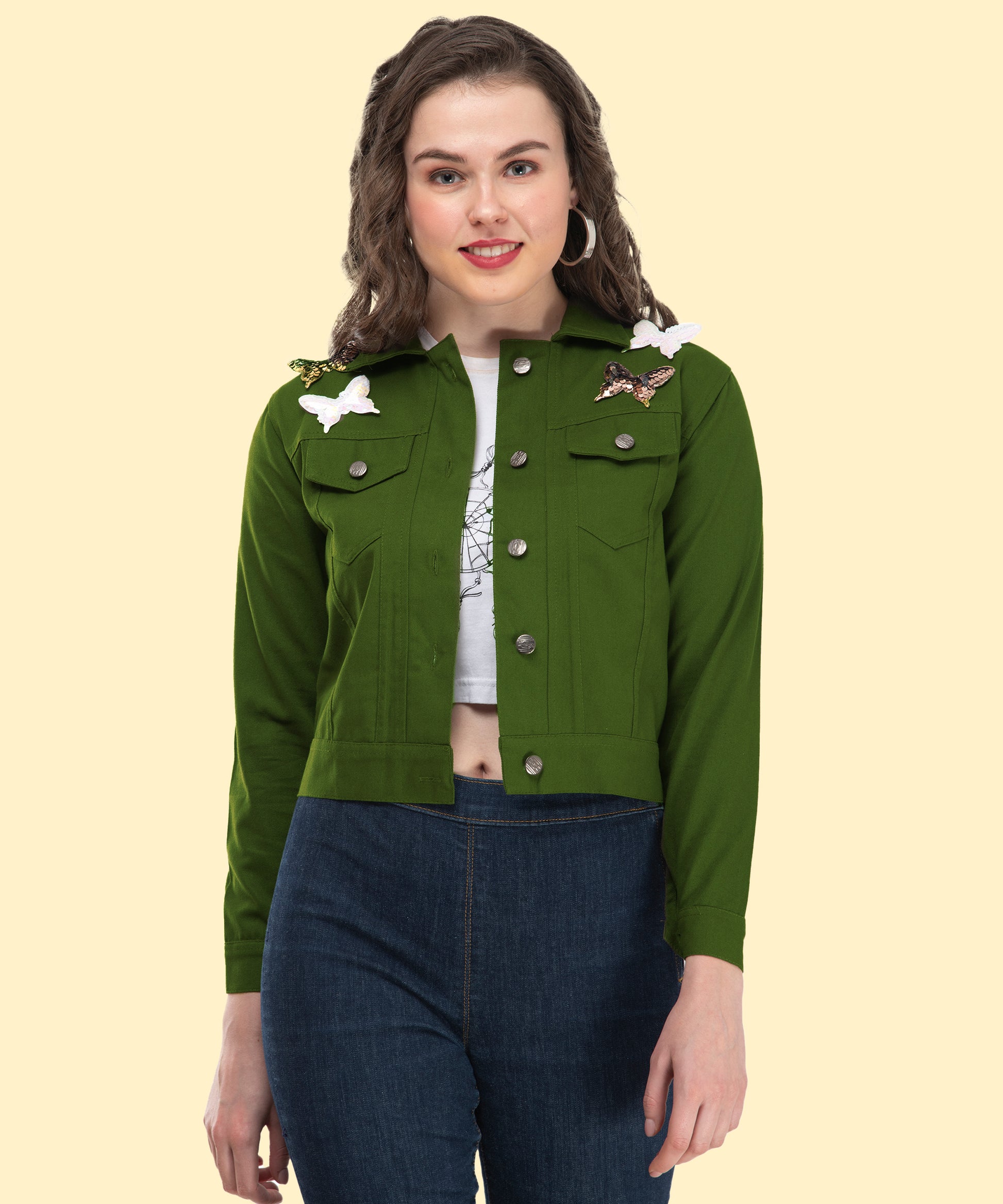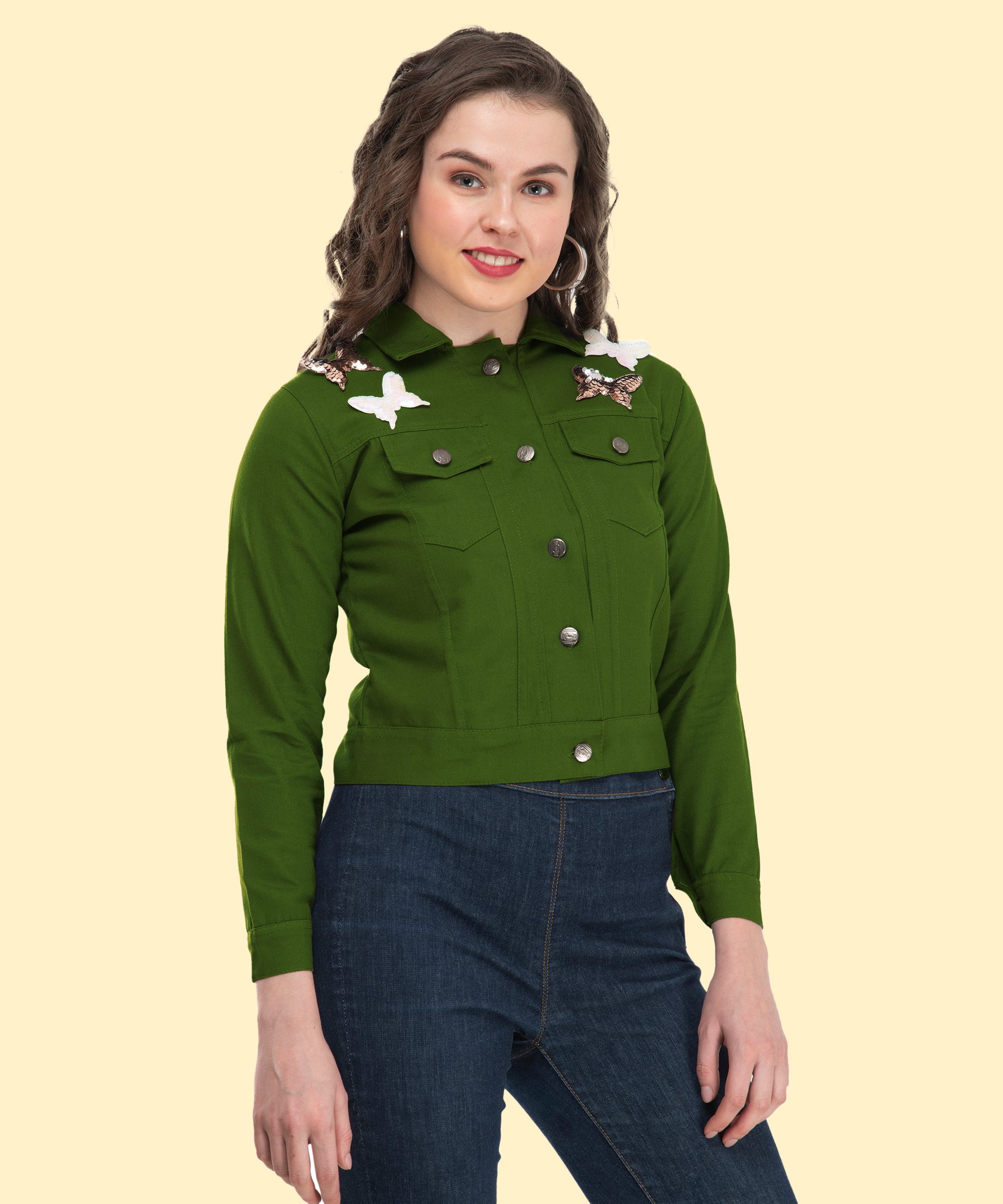 Women's Green Cropped Jacket with Butterfly Accents – Nature Meets Style